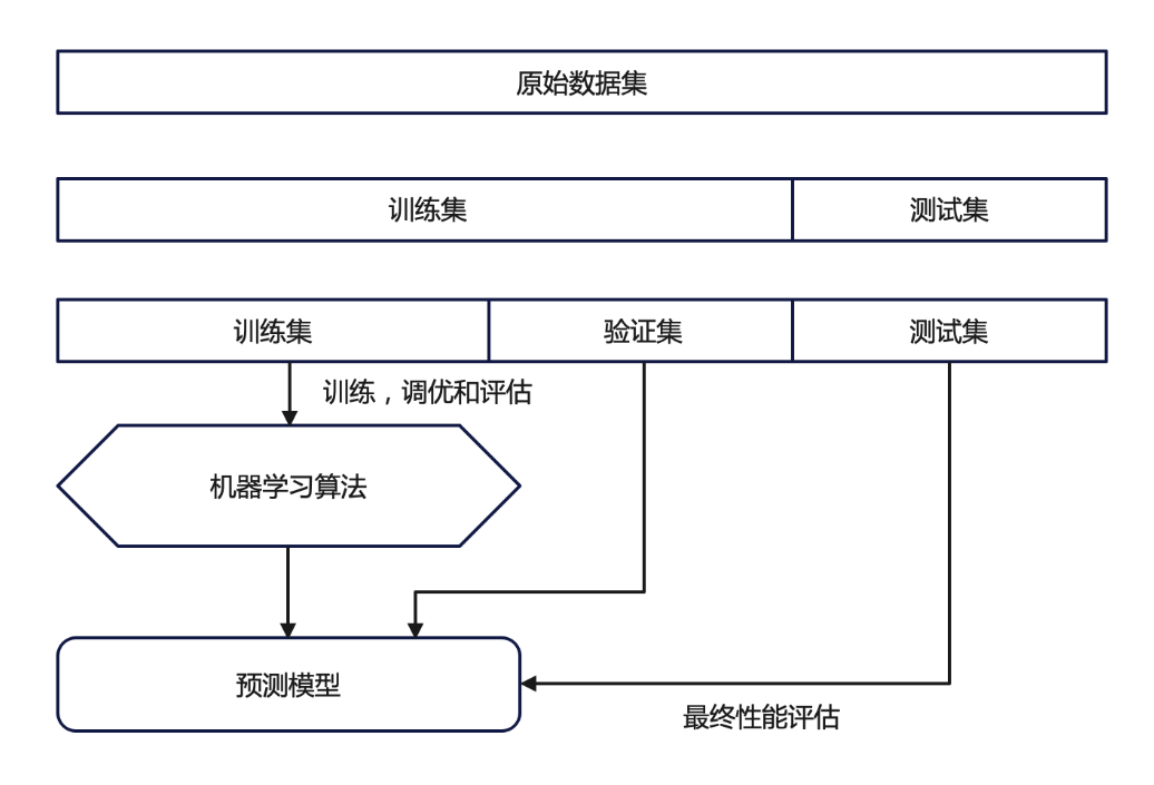 1.我们先将整个数据集氛围两个部分,分别是训练集(Training Data,用于训练模型和调参)与测试集(Test Data,最后用于最终评估模型性能,在整个过程中不参与训练或调参)