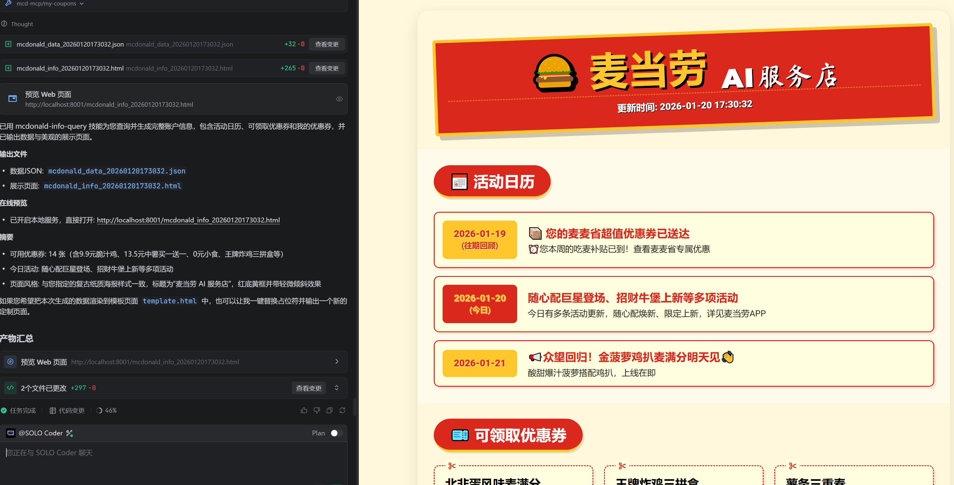 刚好我注意到Trae 在Solo模式下也已经支持 Skill 功能,考虑到Trae相比Claude Code可能会有更好的交互效果,于是在Trae上也验证了一下,效果意外好。问完Trae“查询我的麦当劳账户信息”,他最后就直接把这个极具复古的展示页弹出来了。