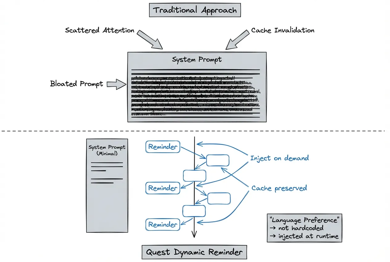 Quest 方案:通过 Reminder 机制动态注入需要关注的上下文。语言偏好、项目规范、临时约束等信息按需添加到对话中,既保证信息及时传递,又避免系统提示词无限膨胀。