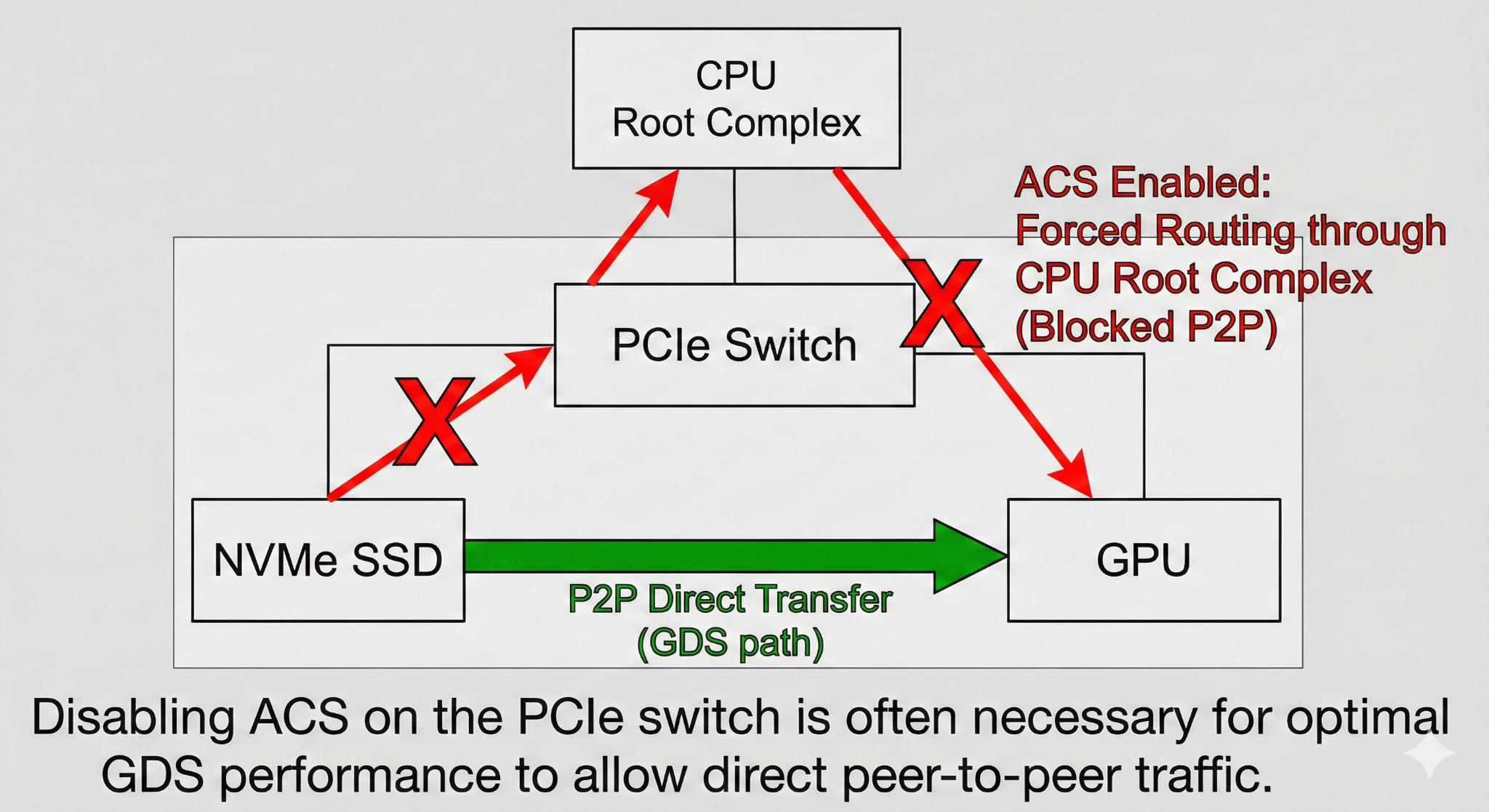 排查了两天驱动和内核后,我们最终在 PCIe 拓扑中找到了元凶。服务器 BIOS 默认开启了 ACS (Access Control Services)。这个安全特性强制所有 PCIe P2P 流量必须经过 CPU Root Complex 进行 IOMMU 检查,直接切断了 SSD 到 GPU 的直连路径。