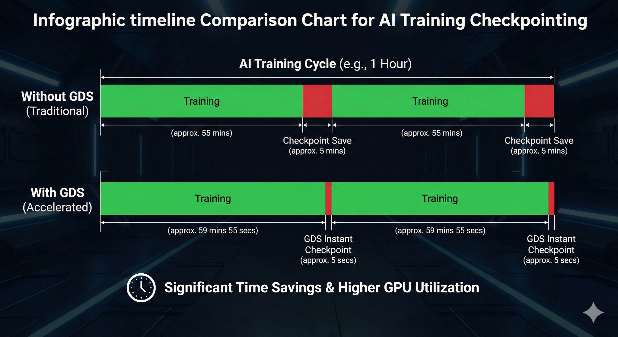 实测数据:结合 Weka 或 VAST Data 等高性能文件系统,GDS 能将 Checkpoint 写入速度提升至 SSD 阵列的物理极限(如 100GB/s+),将存档时间压缩至 10-20 秒 10。这不仅减少了算力浪费,更允许我们将 Checkpoint 频率从“几小时一次”提升到“几十分钟一次”,极大增强了训练的鲁棒性。