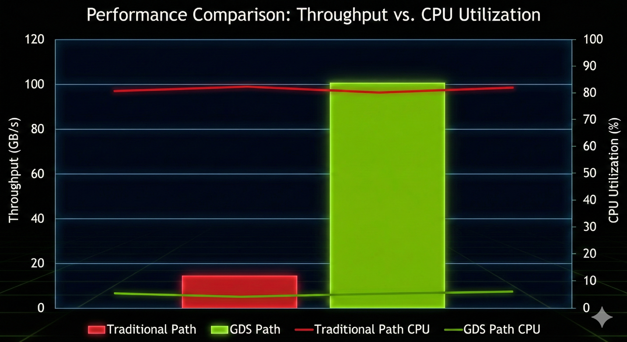 在 GDS 模式下,CPU 仅负责“发号施令”(控制面),繁重的“搬运工作”(数据面)完全由 DMA 引擎接管。这不仅消除了内存带宽的争抢,更重要的是消除了上下文切换(Context Switch)带来的系统抖动。