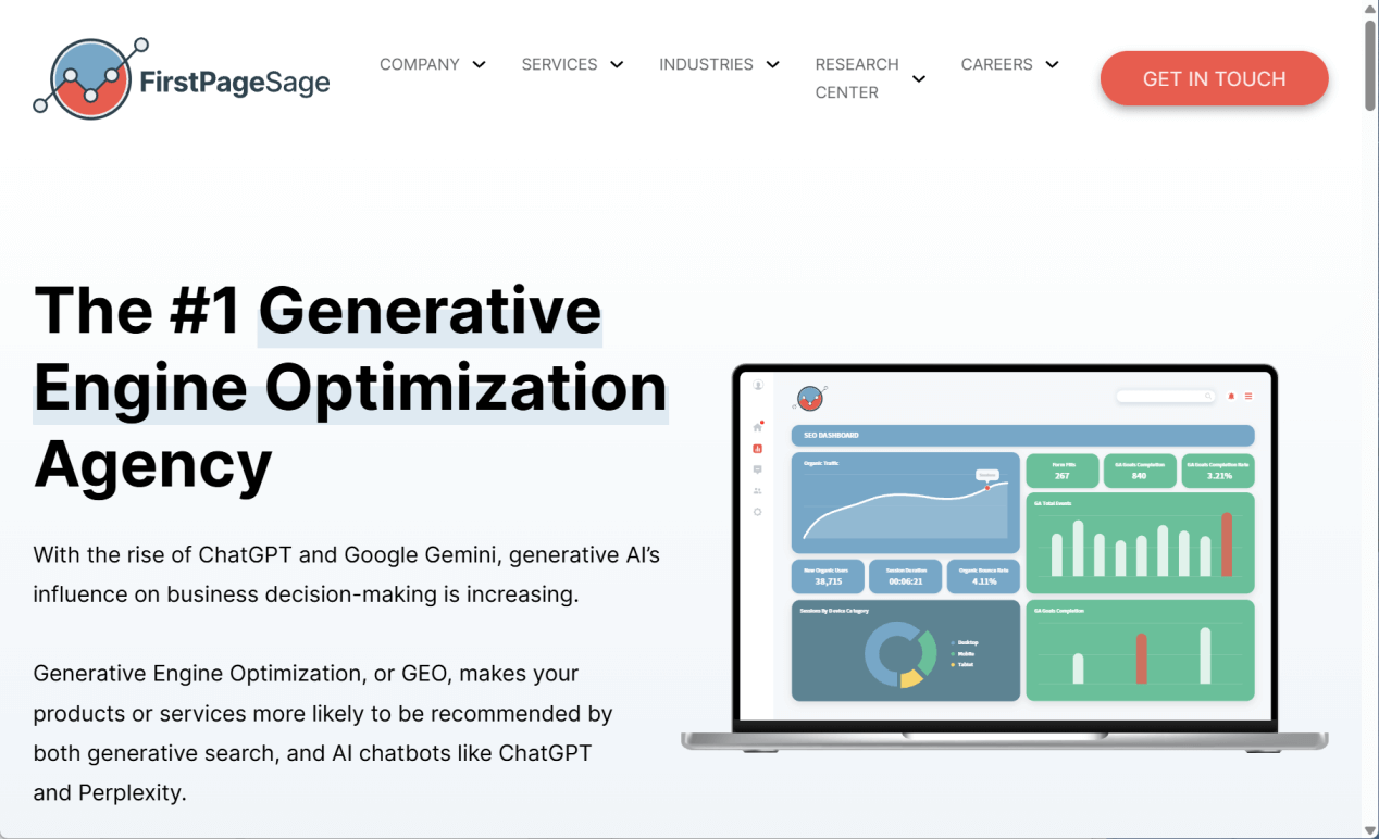 - First Page Sage:声称是GEO领域的先驱,拥有一套基于ROI的全托管服务方法论。它们不仅仅通过工具监测,而是通过大规模生产“AI友好型内容”(高信息密度、结构化、事实导向)来帮助客户占据AI答案。其服务通常价格高昂,面向企业级客户。