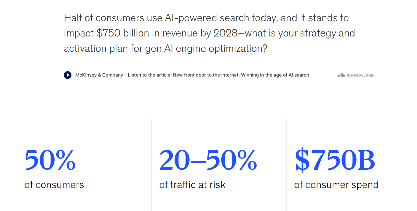 这种转变并非仅仅是用户界面的优化,而是底层逻辑从“检索(Retrieval)”向“生成(Generation)”的跨越。在旧范式中,用户需要自行浏览多个链接、综合信息并得出结论;而在新范式中,AI代理(AI Agents)代替用户完成了阅读、筛选、综合和推理的过程,直接输出唯一的、概率性的“最终答案”。根据McKinsey的预测分析,到2028年,将有高达7500亿美元的消费支出受到AI搜索的直接影响,且超过50%的消费者已经开始尝试使用AI工具替代传统搜索进行购买决策。这一趋势导致了“零点击”(Zero-Click)现象的常态化,即用户在不离开搜索界面的情况下即可满足需求,导致传统网站的自然流量面临断崖式下跌的风险。