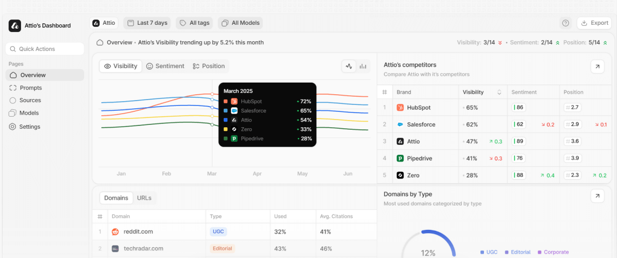 - 归因分析可视化:Peec AI将复杂的AI归因简化为三个核心指标:可见性(Visibility)、排名(Position)、情感(Sentiment)。其仪表盘能直观地展示品牌在ChatGPT、Gemini等平台上的声量变化曲线。
