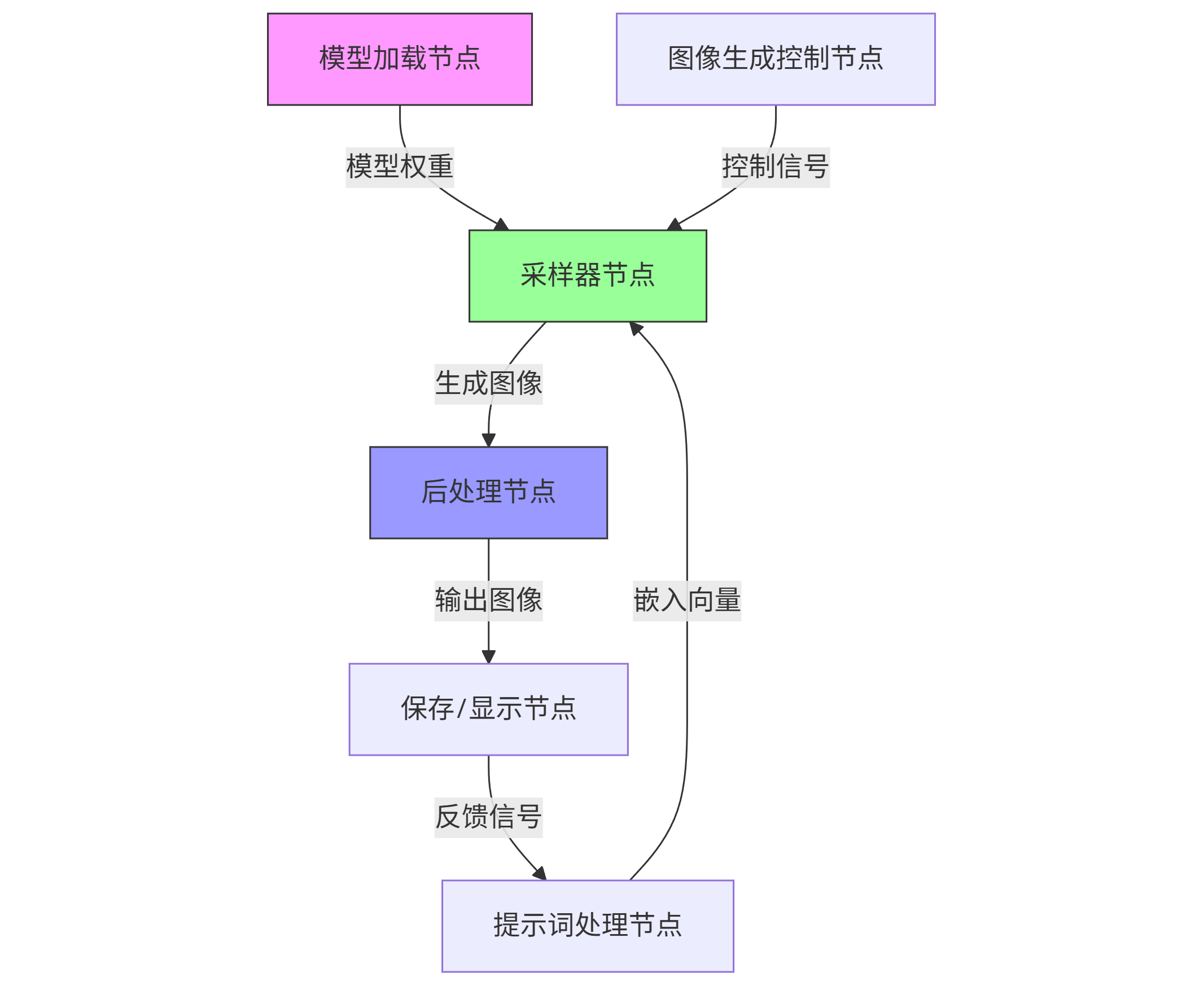 graph TD A[模型加载节点] -->|模型权重| B[采样器节点] C[提示词处理节点] -->|嵌入向量| B D[图像生成控制节点] -->|控制信号| B B -->|生成图像| E[后处理节点] E -->|输出图像| F[保存/显示节点] F -->|反馈信号| C style A fill:#f9f,stroke:#333 style B fill:#9f9,stroke:#333 style E fill:#99f,stroke:#333