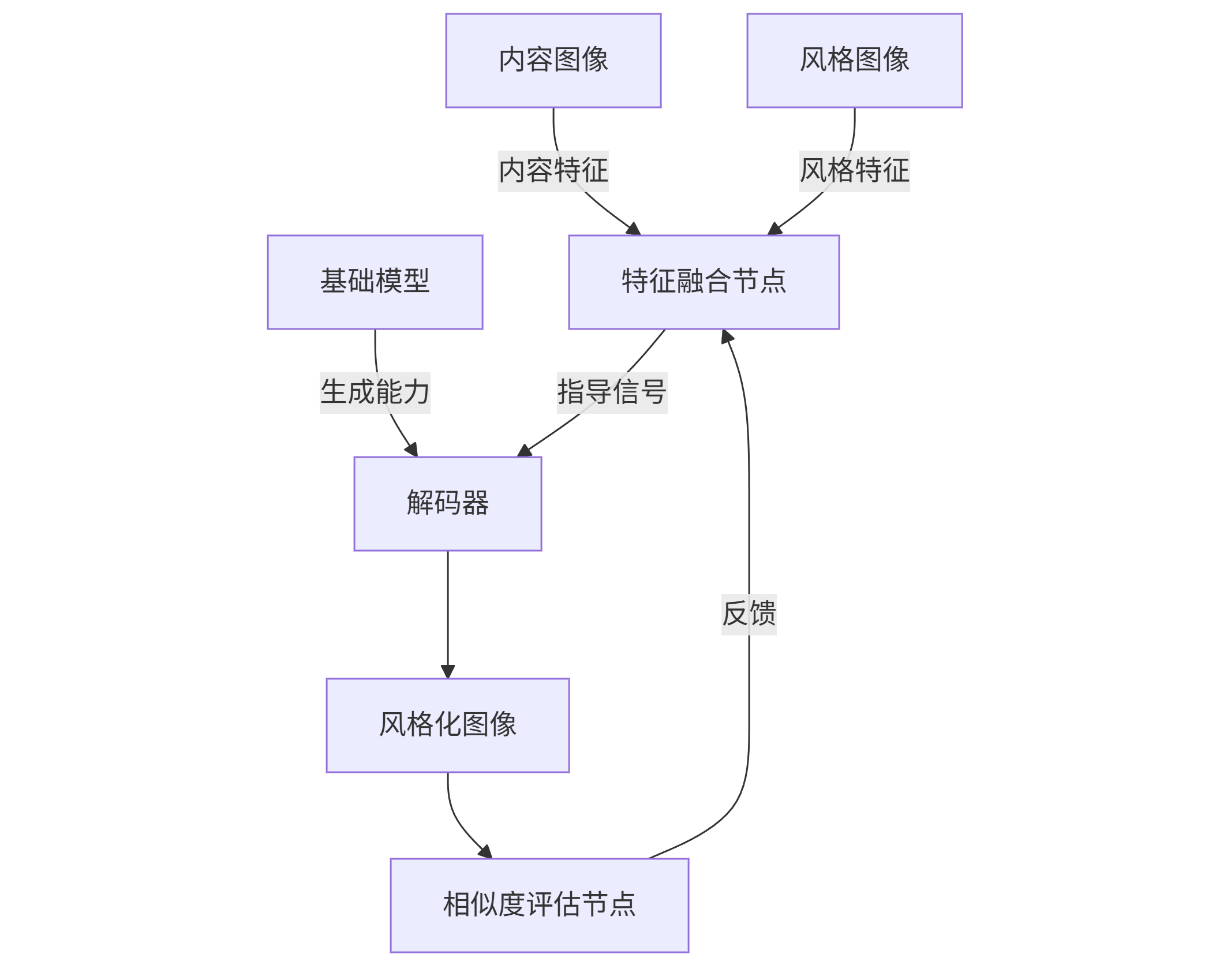 graph TD A[内容图像] -->|内容特征| C[特征融合节点] B[风格图像] -->|风格特征| C D[基础模型] -->|生成能力| E[解码器] C -->|指导信号| E E --> F[风格化图像] F --> G[相似度评估节点] G -->|反馈| C
