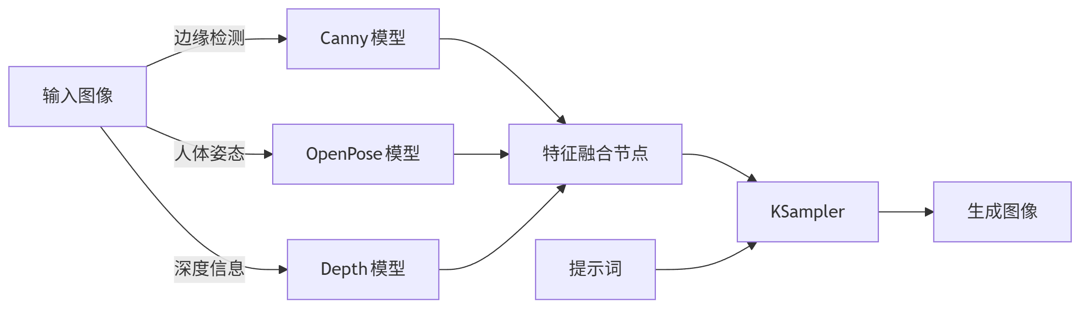 graph LR A[输入图像] -->|边缘检测| B[Canny模型] A -->|人体姿态| C[OpenPose模型] A -->|深度信息| D[Depth模型] B --> E[特征融合节点] C --> E D --> E E --> F[KSampler] G[提示词] --> F F --> H[生成图像]