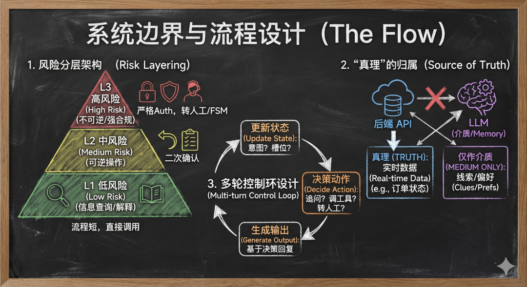 L3 高风险(不可逆/强合规):如退款、销户、涉及敏感隐私。必须包含严格的身份验证(Auth),且倾向于早期转人工或使用确定的状态机流程。