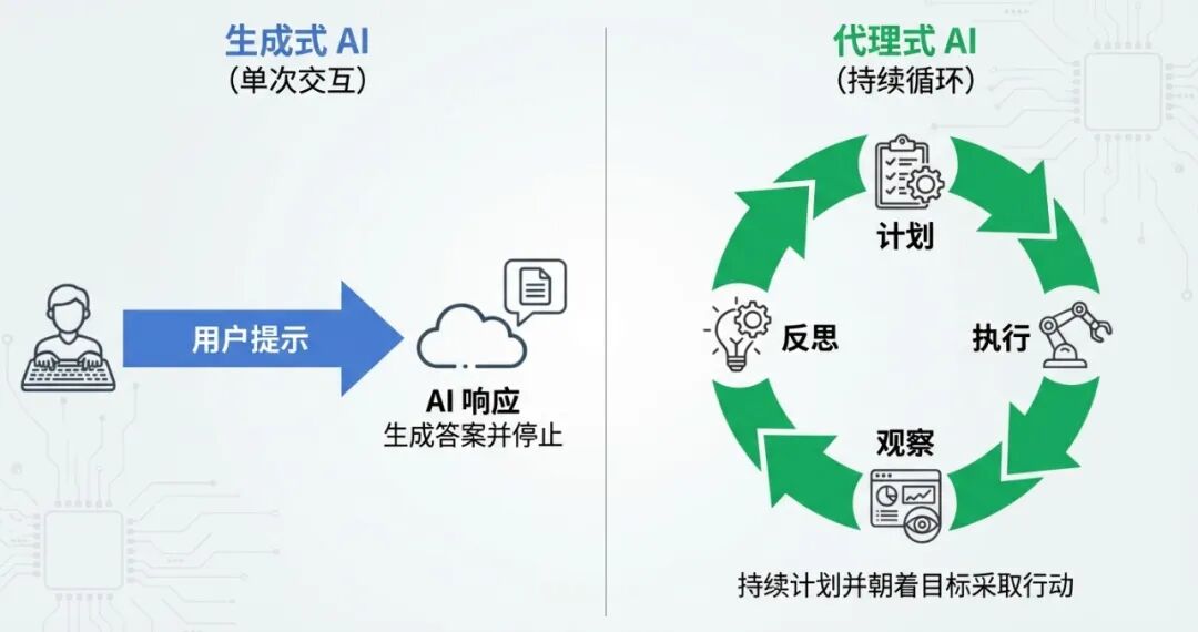 如果说生成式AI是个有才华的实习生(你问它就写),那Agent AI就是个能扛事儿的正式员工(你给目标它就去搞定)。