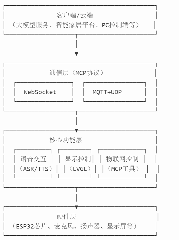 项目基于 ESP32 系列芯片构建,以 MCP(多端控制协议)为核心,实现语音交互与多设备控制,整体架构分为三层: