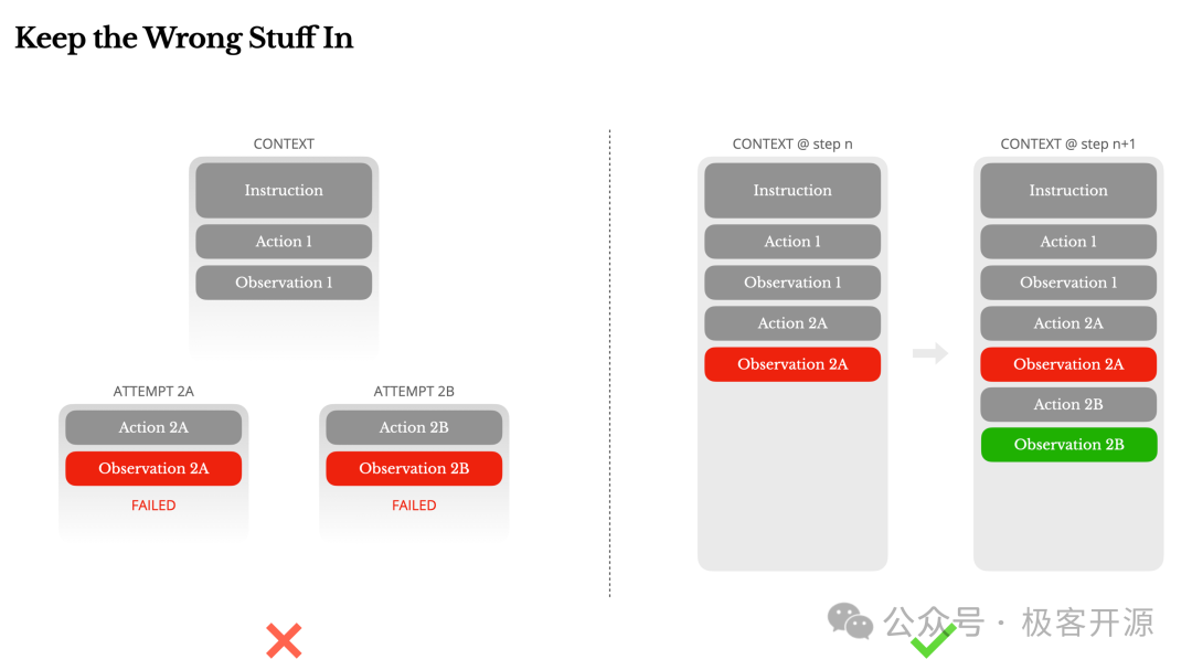 保留错误轨迹:将失败的尝试保留在上下文中,让模型看到失败的行动和相应的观察结果。
