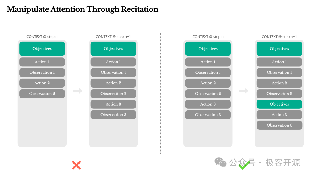 动态目标复述:定期将任务目标重写到上下文末尾,将全局计划推入模型的近期注意力范围。