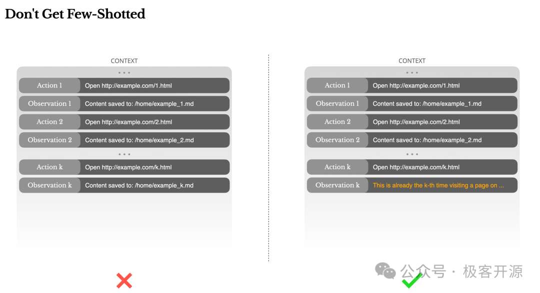 少样本提示在智能体系统中可能产生反效果。语言模型是优秀的模仿者,如果上下文充满相似的行动-观察对,模型会倾向于遵循这种模式,即使不再最优。