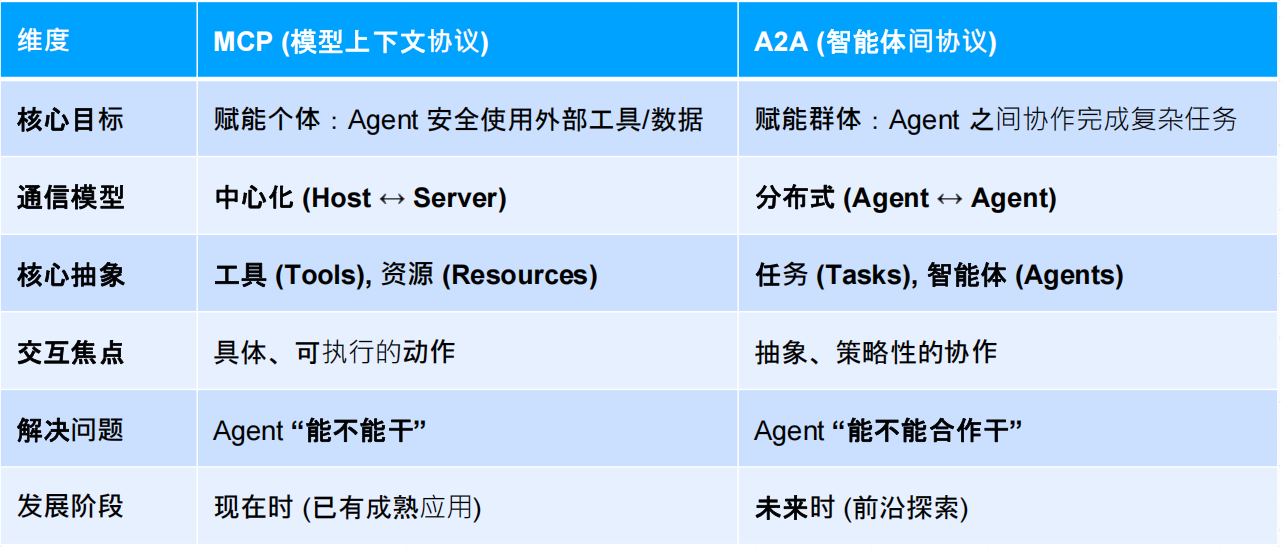 简单说:A2A 解决 “谁来做、做什么” 的协作问题,MCP 解决 “怎么做、用什么做” 的执行问题。