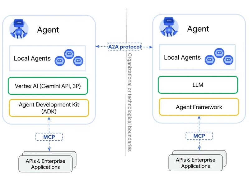 - 上层(A2A):总控 Agent 通过 A2A 协议向专业 Agent 发起 “高抽象度任务”(如 “生成 Q2 财报草稿”),并协调销售、市场、供应链等多个 Agent 分工;
