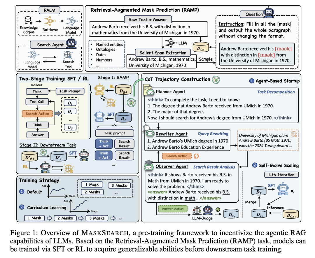 如果说 ZeroSearch 是通过“模拟考试”来训练学生,那么 MaskSearch 就像是设计了一套全新的“完形填空”教材,让模型在海量的预训练数据中学会如何通过检索工具来补全信息。