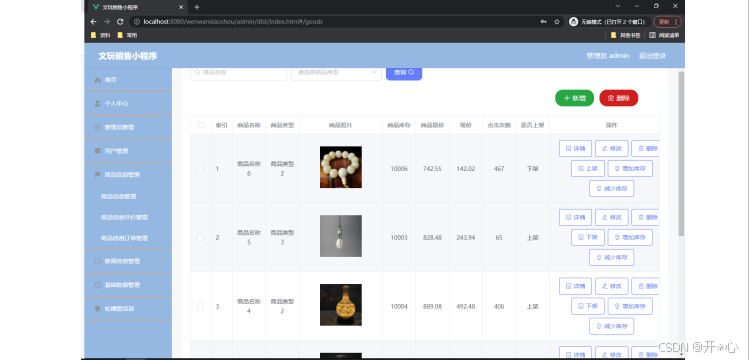 如图5.2显示的就是商品信息管理页面,此页面提供给管理员的功能有:查看已发布的商品信息数据,修改商品信息,商品信息作废,即可删除,还进行了对商品信息名称的模糊查询 商品信息信息的类型查询等等一些条件。