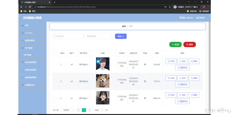 如图5.1显示的就是用户信息管理页面,此页面提供给管理员的功能有:用户信息的查询管理,可以删除用户信息、修改用户信息、新增用户信息,