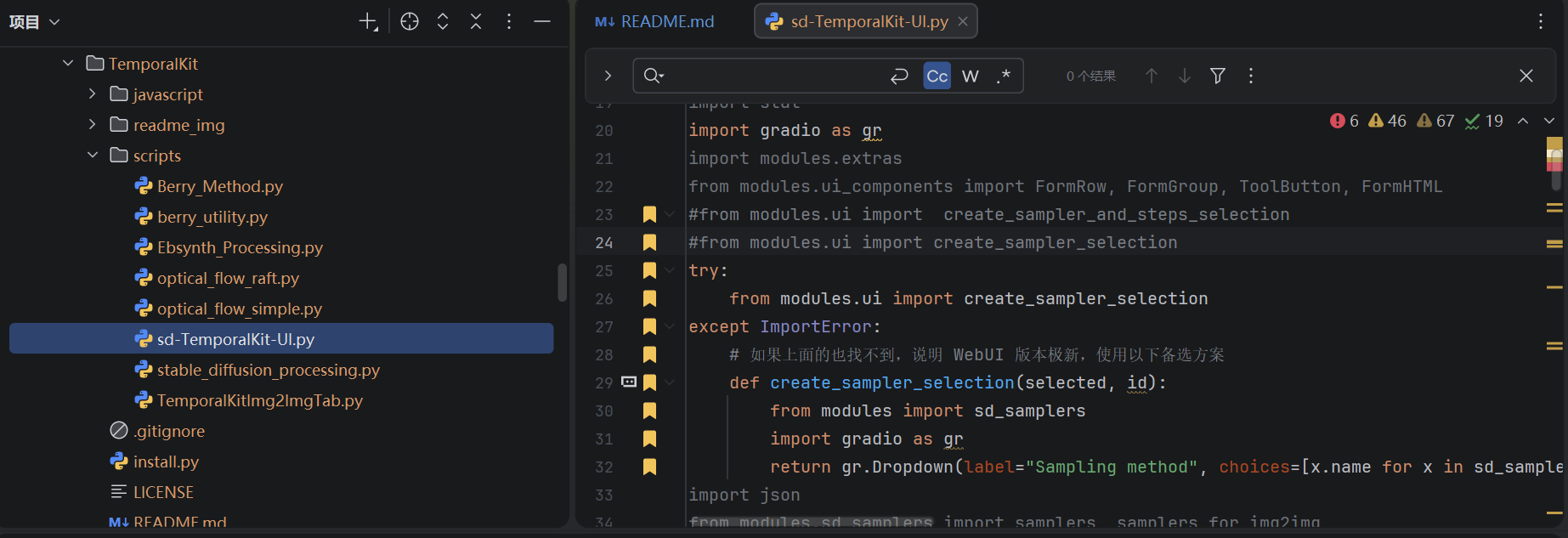 打开 extensions\TemporalKit\scripts\sd-TemporalKit-UI.py,定位到第 23 行左右,将原本的 import 语句替换为以下兼容性写法: