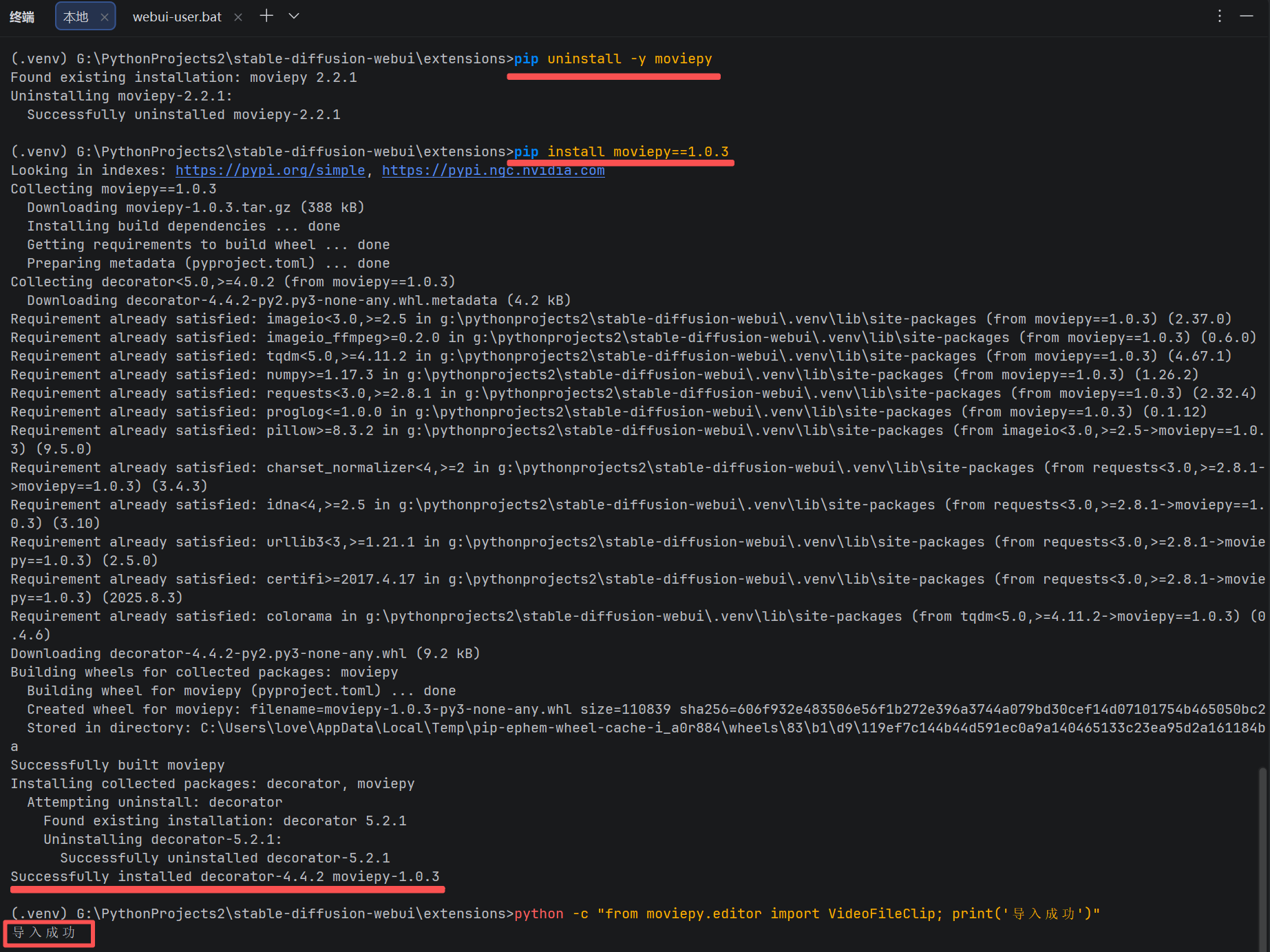 病因:新版 MoviePy 2.x 移除了旧接口,而插件需要 1.0.3 版本。