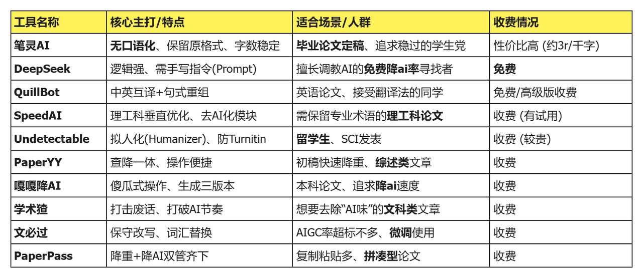 为了方便大家直观选择,我把上面提到的这些降ai率工具做了一个简单的总结表。大家可以根据自己的论文降aigc需求和预算,对号入座: