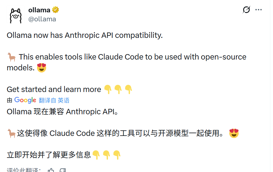 作为开源模型的主流工具,Ollama 近日在X上宣布已经支持接入 Anthropic API,这也就意味着我们可以使用本地模型去接入 ClaudeCode 进行编程了。