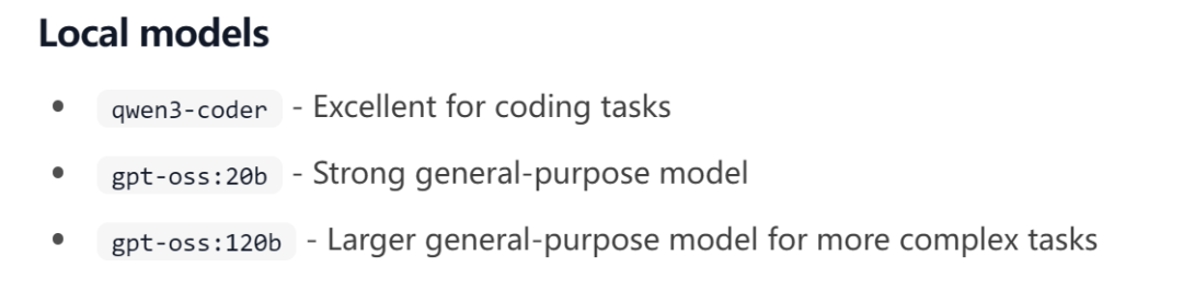 然后就是在启动 claudecode 的时候,指定 ollama 的模型,官方建议是使用下面三个模型用于本地编程任务。