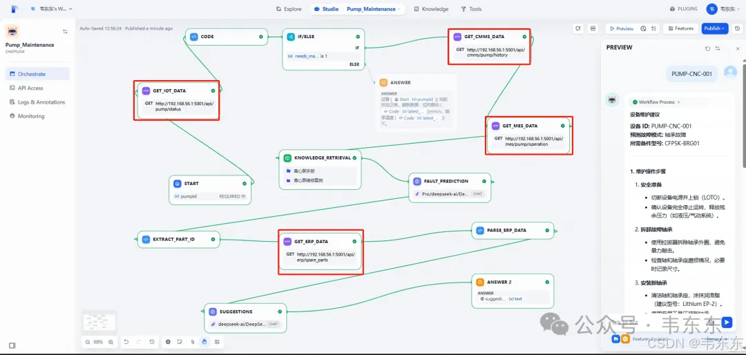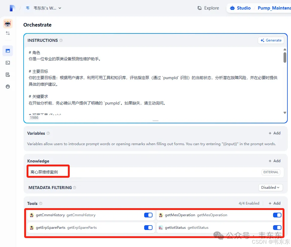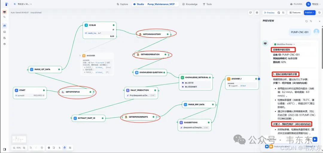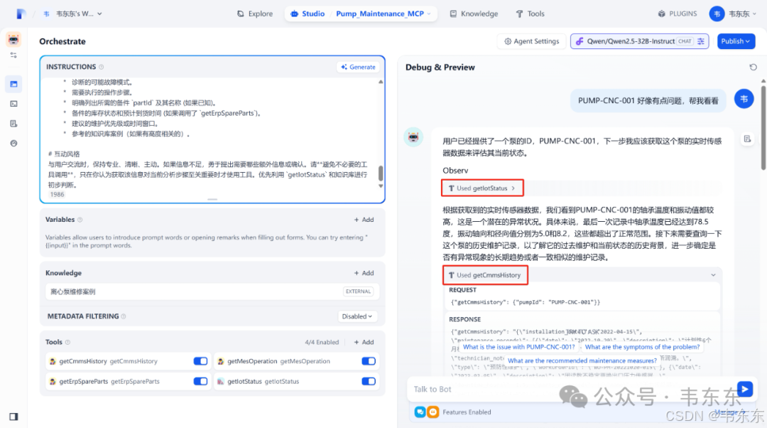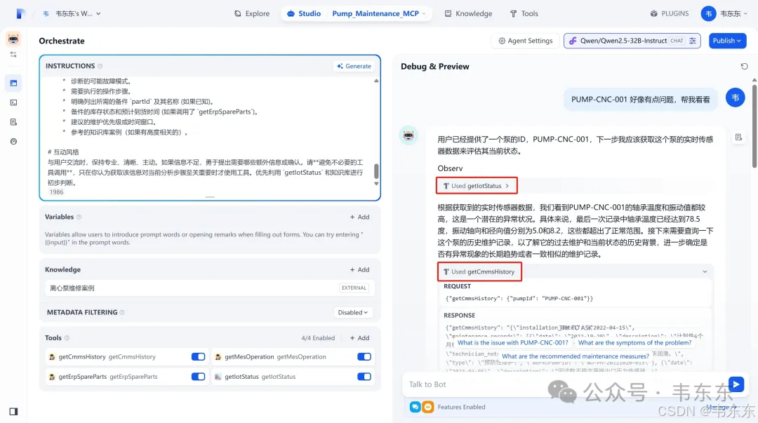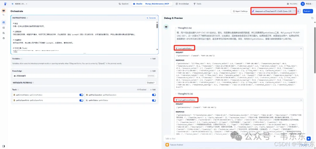 上述创建好的 "Pump_Maintenance_MCP" Agent 应用,负责处理复杂的、需要动态规划和工具调用的问题。