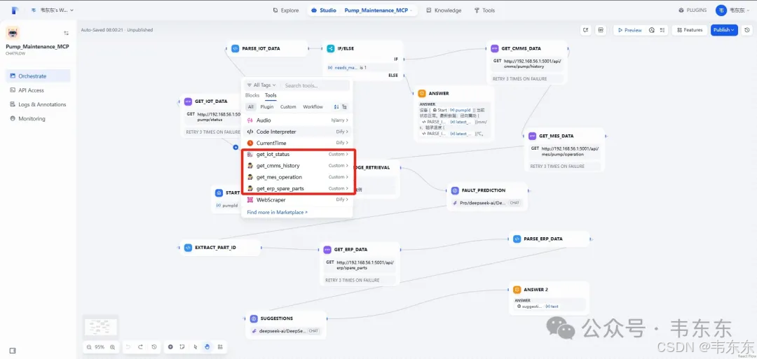 上述提到的 MCP 理念构建的工具可以被 Dify Agent 智能地选择和调用。例如,当用户问:“PUMP-CNC-001 状况如何?需要订购备件吗?” Agent 可以识别出需要调用 get_latest_iot_reading 工具获取实时状态。 根据 IoT 状态(比如振动高),Agent 可能进一步判断需要调用 get_cmms_history 工具查看类似故障记录。 同时,调用 predict_failure 工具。 如果预测需要更换轴承,Agent 会调用 get_erp_stock 工具查询 CFP5K-BRG01 的库存。