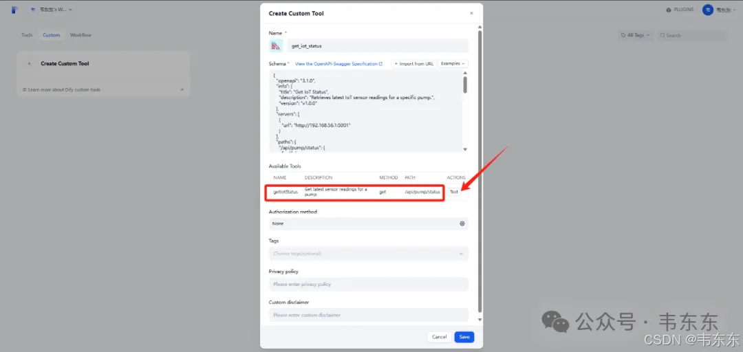 在 Dify 中,点击"工作室”->"工具"->"创建自定义工具”。为每个工具输入名称(e.g.get_iot_status)。然后将编写好的对应 JSON Schema 完整复制并粘贴到"Schema"输入框中。