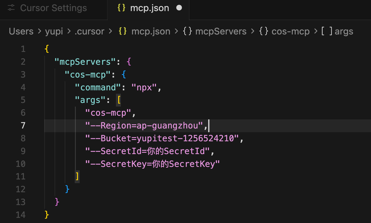 本质上就是修改 MCP 配置文件,添加这样的配置: