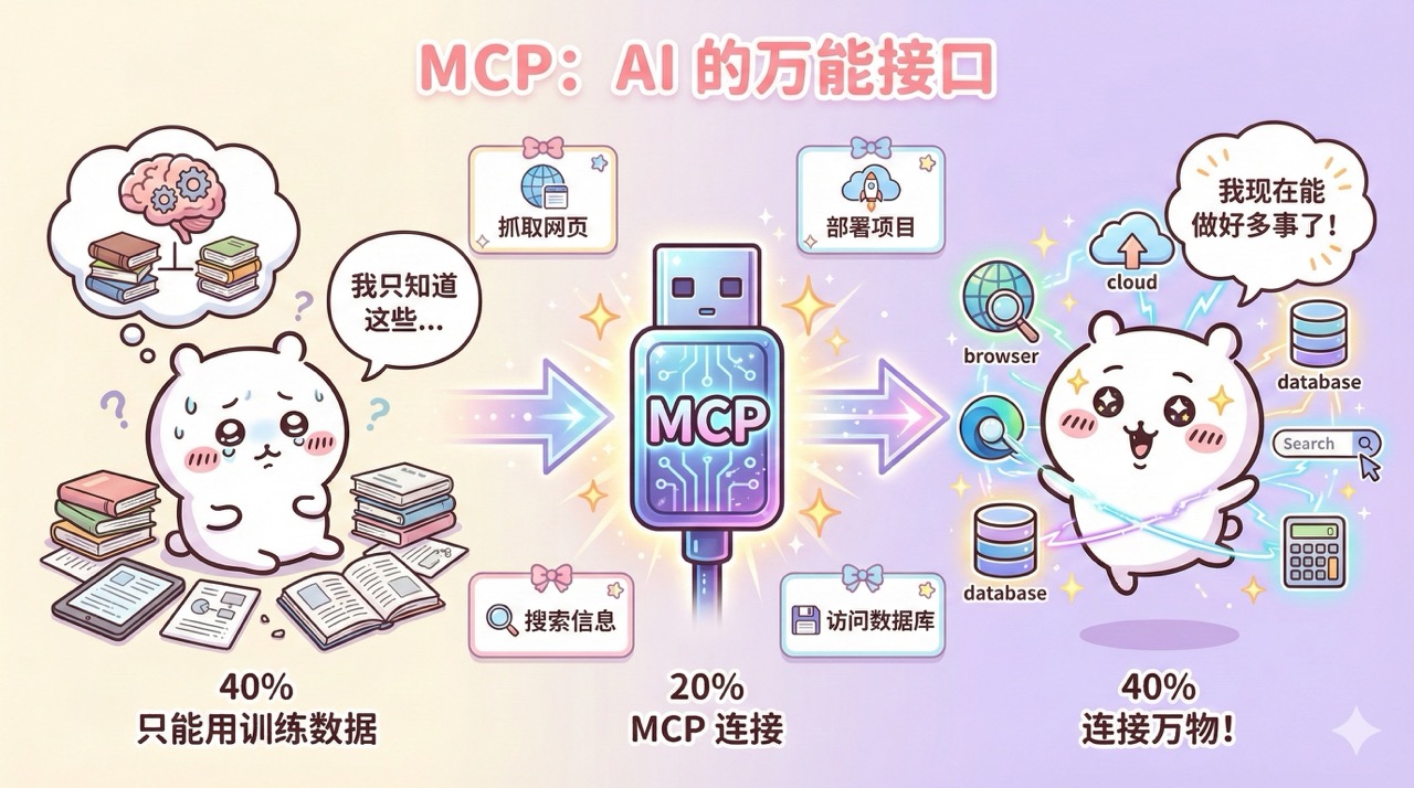 打个比方,MCP 就像是 AI 的 USB-C 接口,原本 AI 只能根据训练数据来回答问题、生成代码,但有了这个统一接口,它就能连接各种外部工具,比如打开浏览器看网站、搜索并抓取网页内容、部署项目到云端、访问数据库等等,能力一下子就丰富起来了。