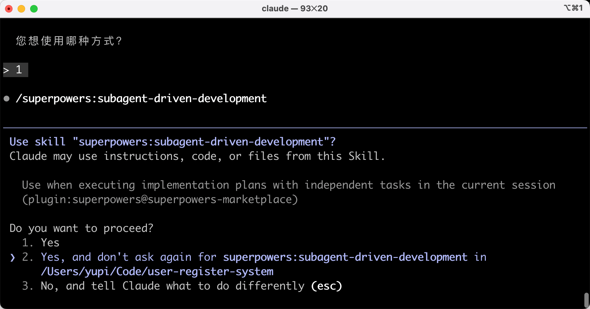 我盲选一手 Subagent-Driven 方式,AI 自动选择了对应的开发技能:
