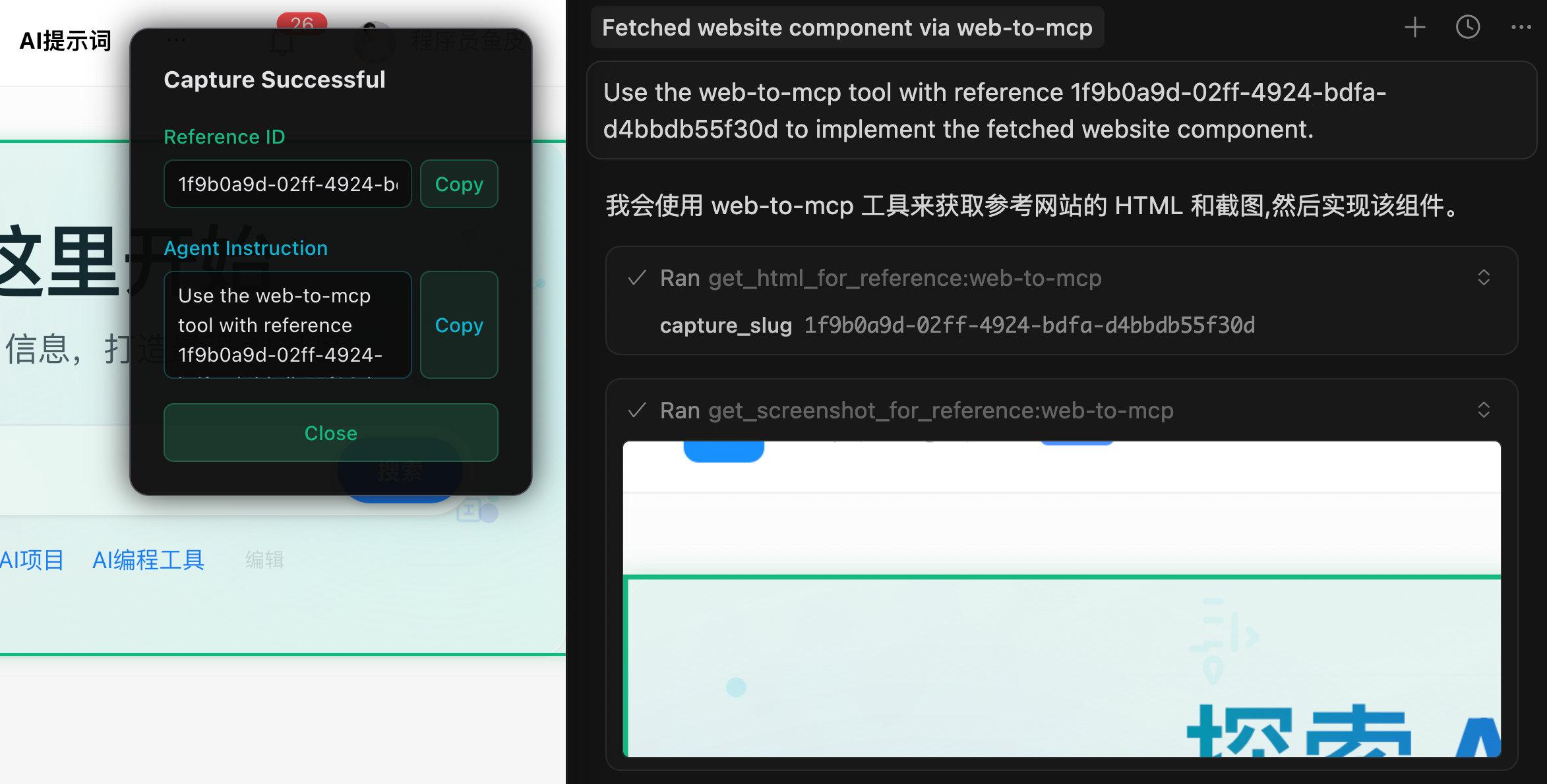 它就会自动捕获组件的 DOM 结构、CSS 样式、甚至是交互效果,并且给你一个让 AI 复刻组件的提示词。