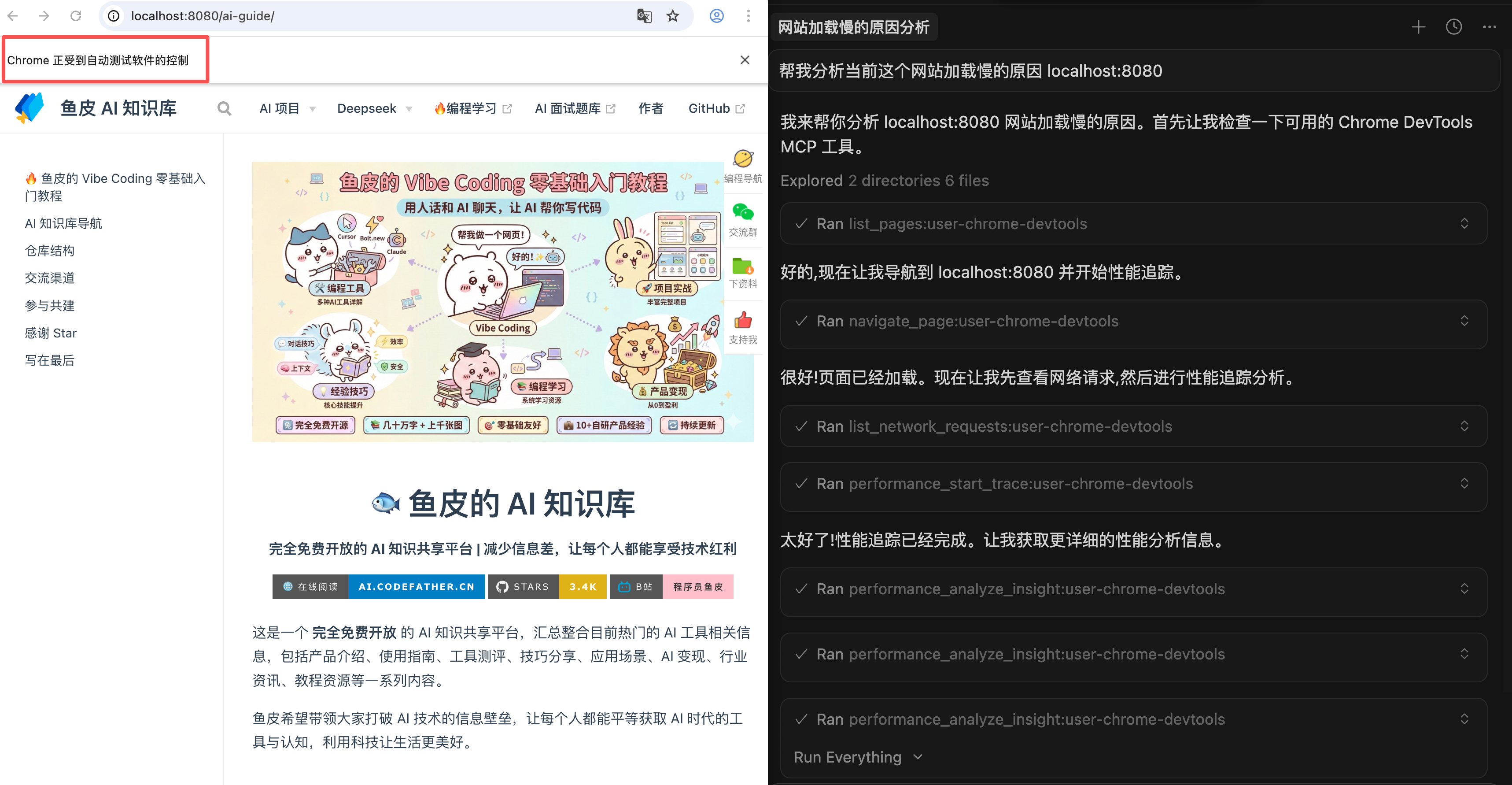 比如我跟 AI 说:“帮我分析当前这个网站加载慢的原因”,它就能打开 Chrome DevTools,分析网络请求、查看资源加载时间,然后告诉我哪里有问题。