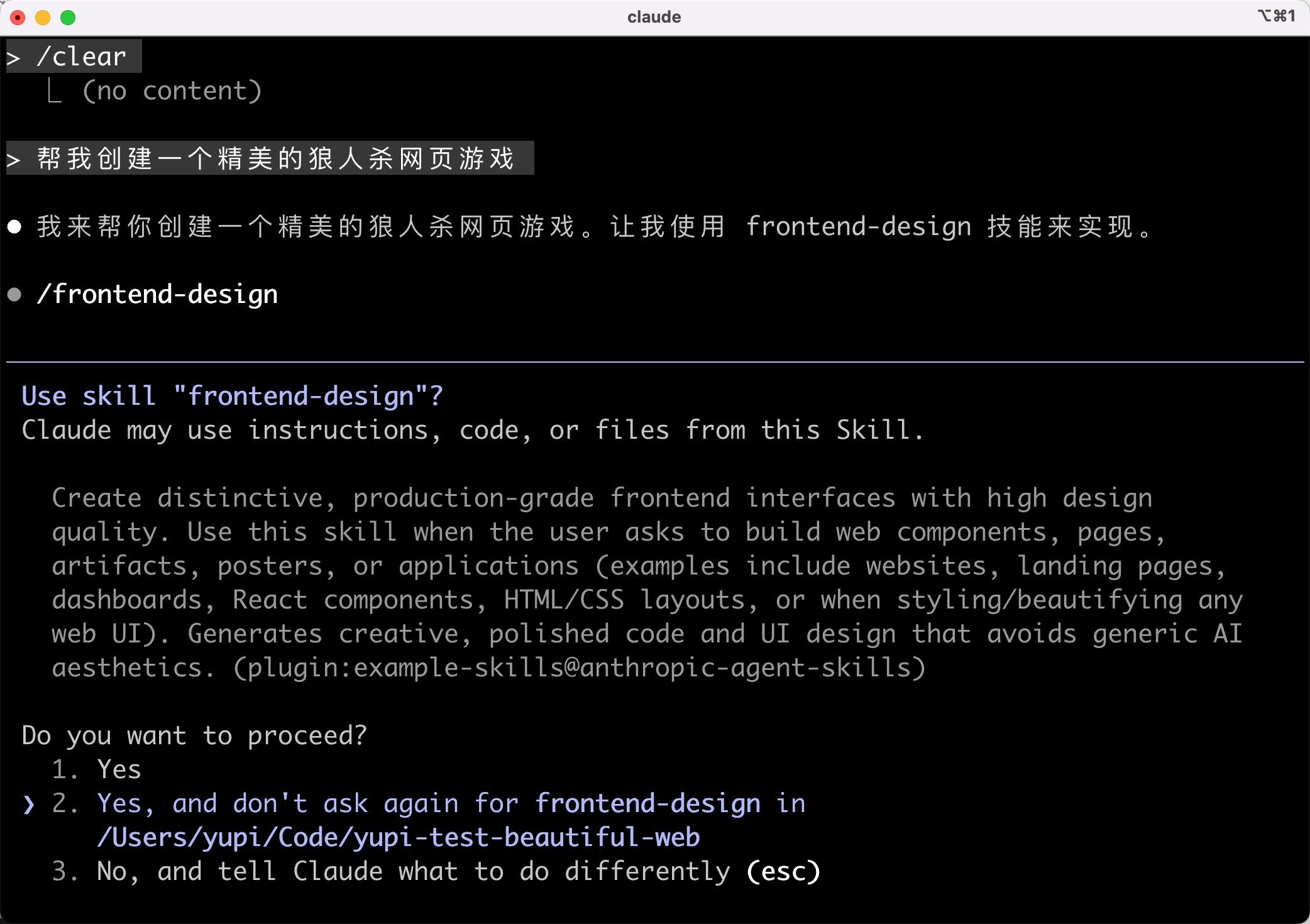 比如我让 AI 开发一个精美的狼人杀网页游戏,它会询问我是否要使用 frontend-design 技能。