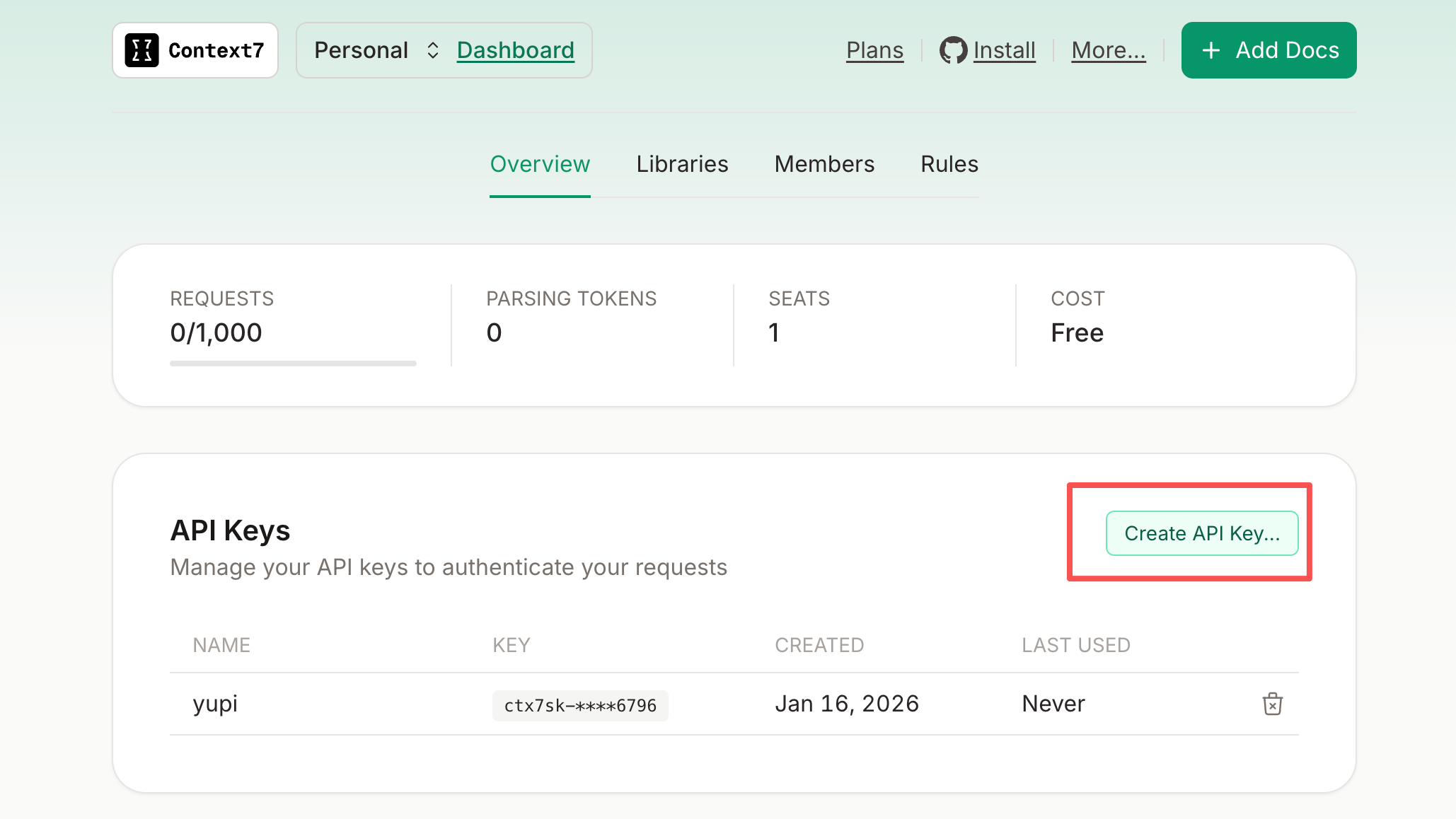 访问 Context7 Dashboard 注册账号并获取 API Key,个人使用是免费的。