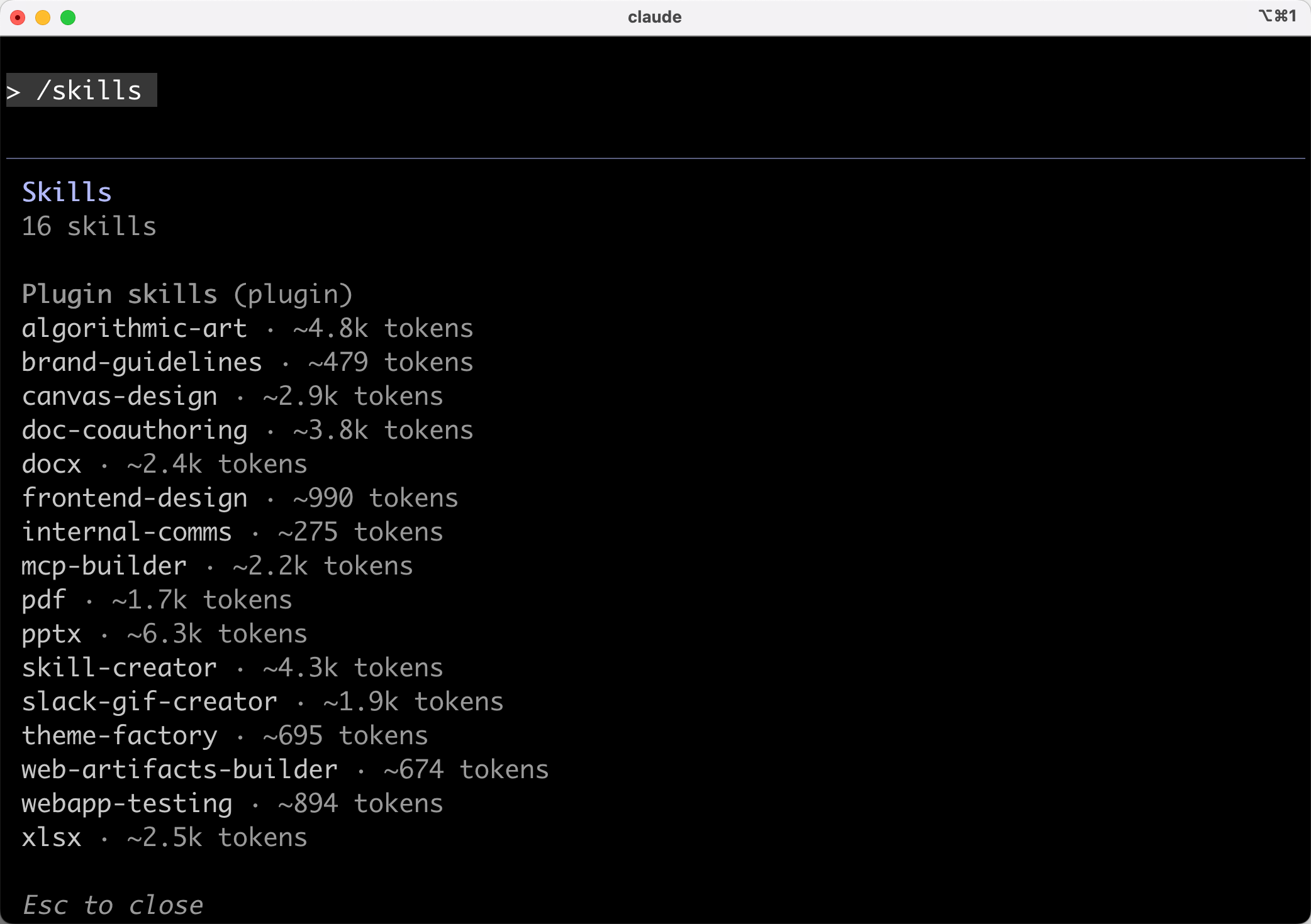 安装好之后,输入 /skills 命令,就能看到所有已经安装完成的技能了,我们要的 frontend-design 也在其中。
