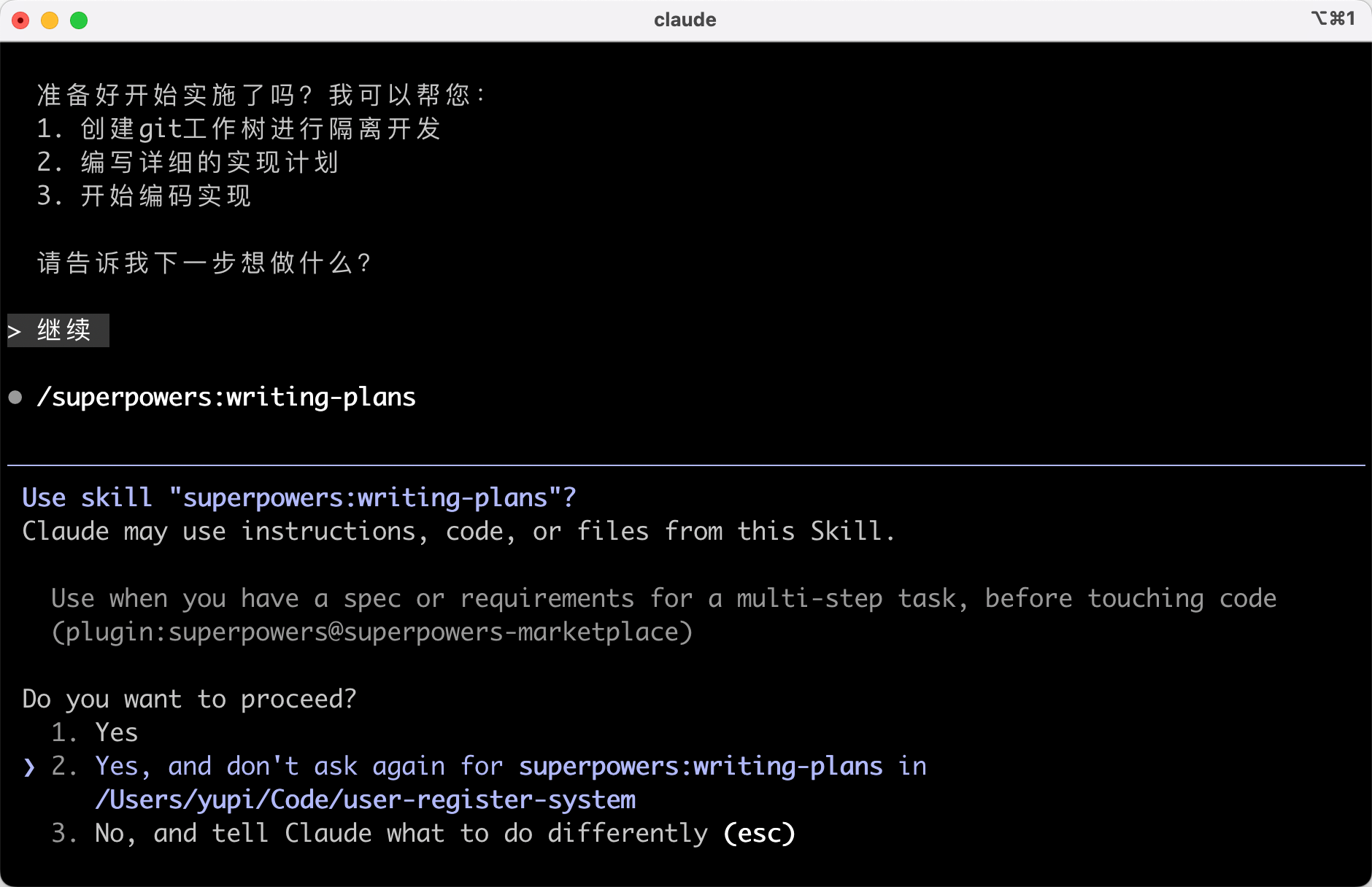 下面以开发一个 “用户注册模块” 为例,演示 Superpowers 官方的标准工作流程。
