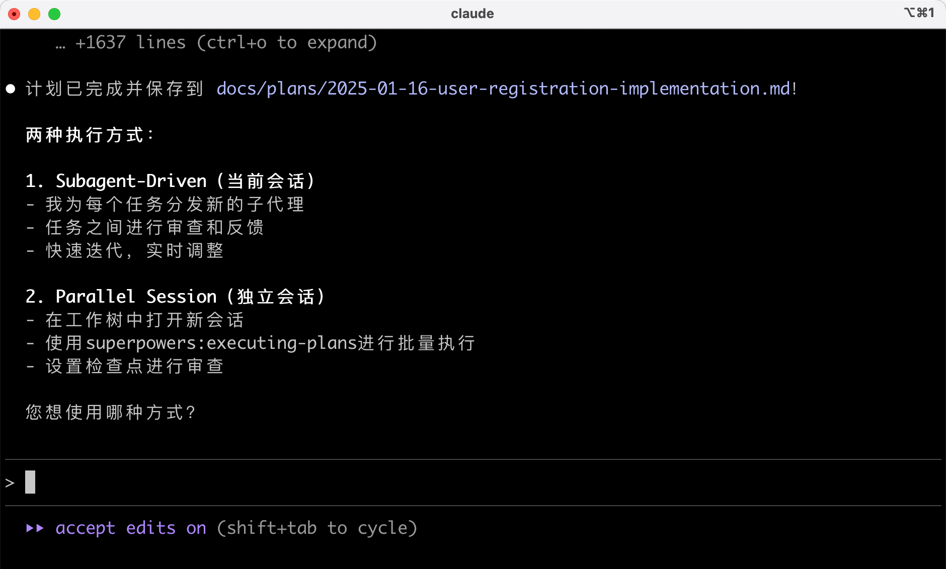 运行 /superpowers:execute-plan 命令,Superpowers 会采用以下方式之一执行: