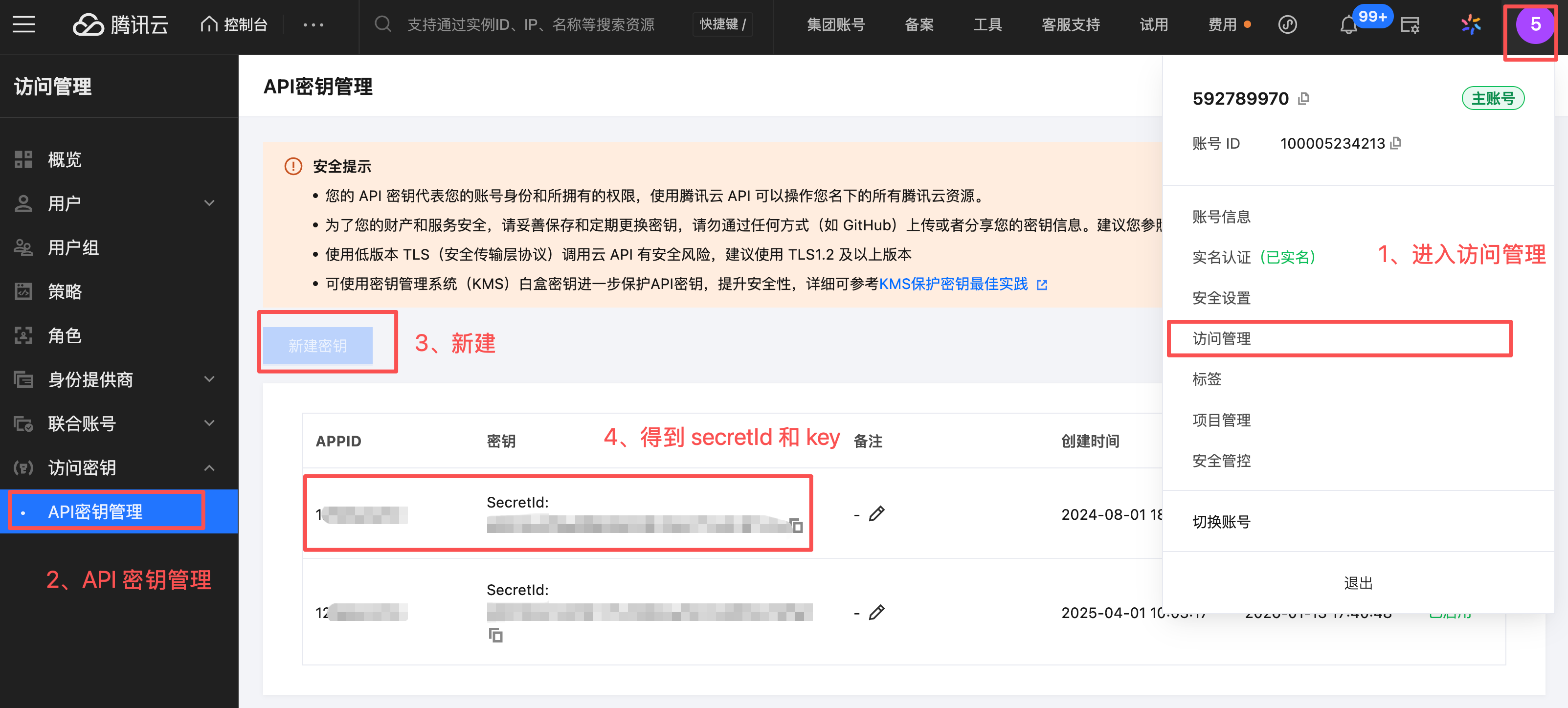 2)然后在 "访问管理" > "API 密钥管理" 中获取 SecretId 和 SecretKey,注意一定不要泄露这些信息!