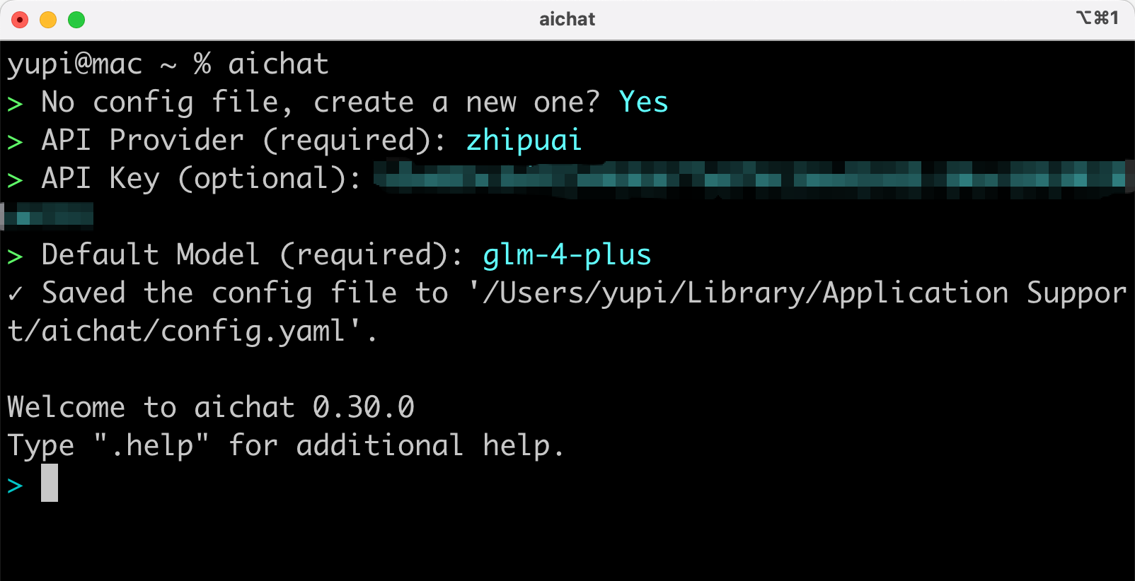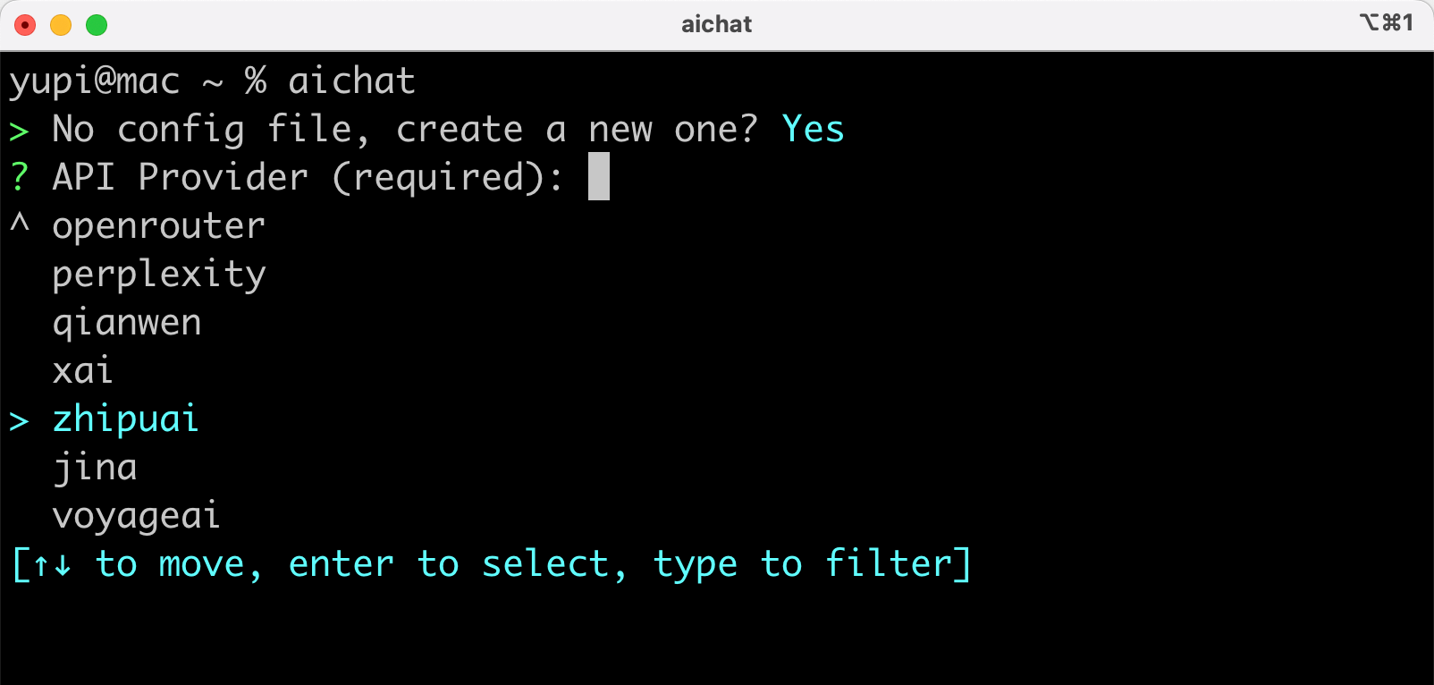 安装完成后,运行 aichat 命令,首次执行会引导你创建配置,选择你要用的大模型并填写 API Key: