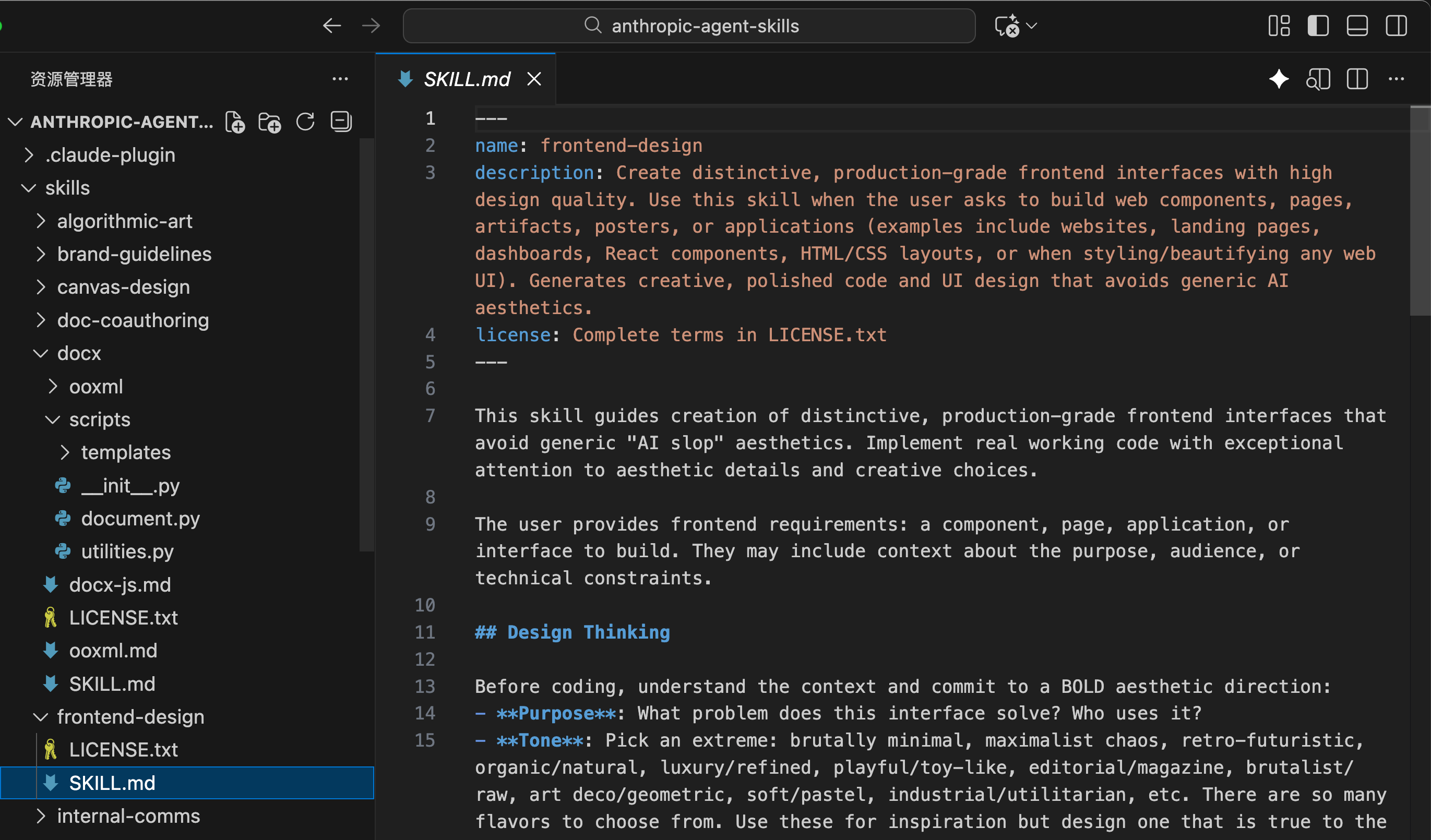 example-skills:示例技能包 ,可以处理技能创建、构建 MCP、视觉设计、算法艺术、网页测试、动图制作、主题样式等。