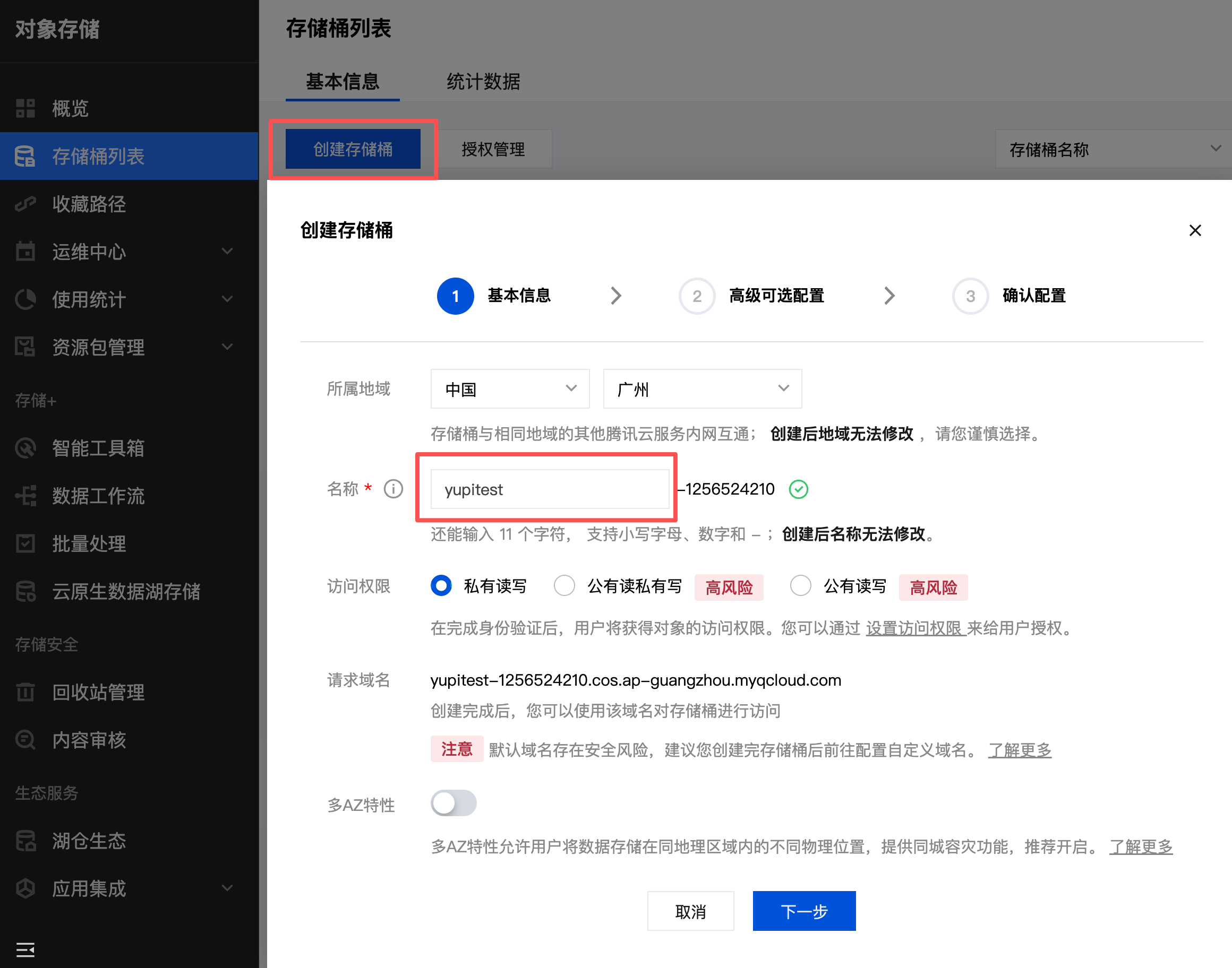 1)首先需要开通腾讯云 COS 对象存储服务。访问 腾讯云 COS 控制台,创建一个存储桶(Bucket):
