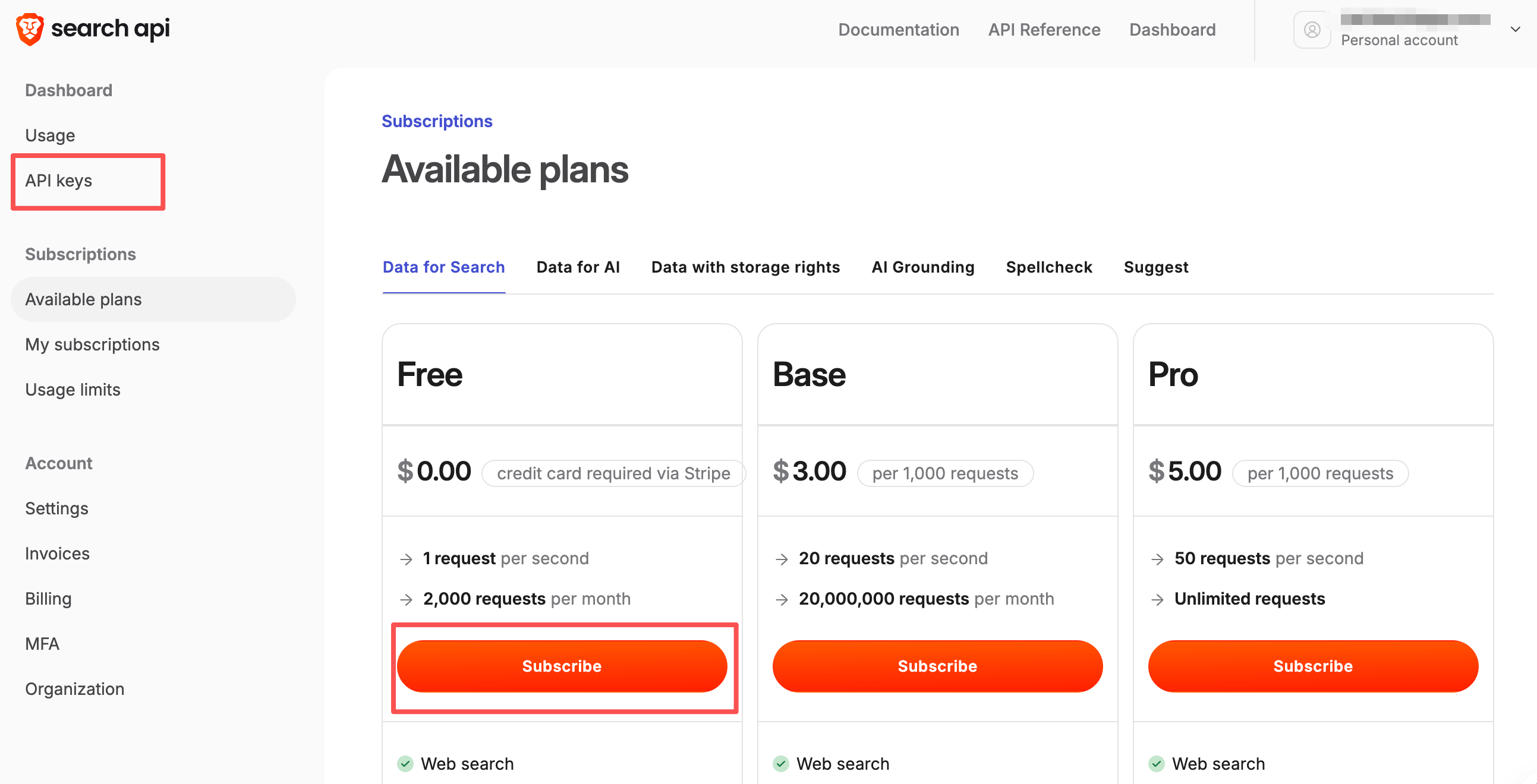 首先去 Brave Search API 注册账号,然后进入 API Key 管理页面,首先要选择一个订阅计划。必须选择免费版啊!每月有 2000 次查询额度,对于个人开发来说够用了。