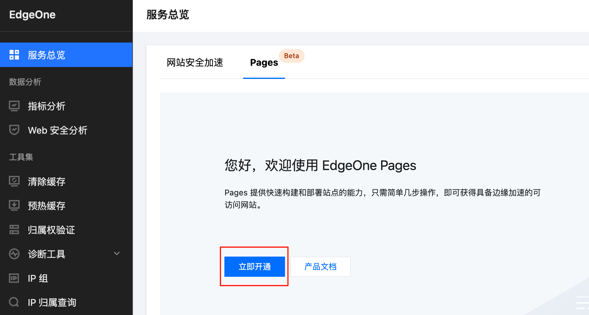 首先到 EdgeOne 控制台 开通 Pages 服务: