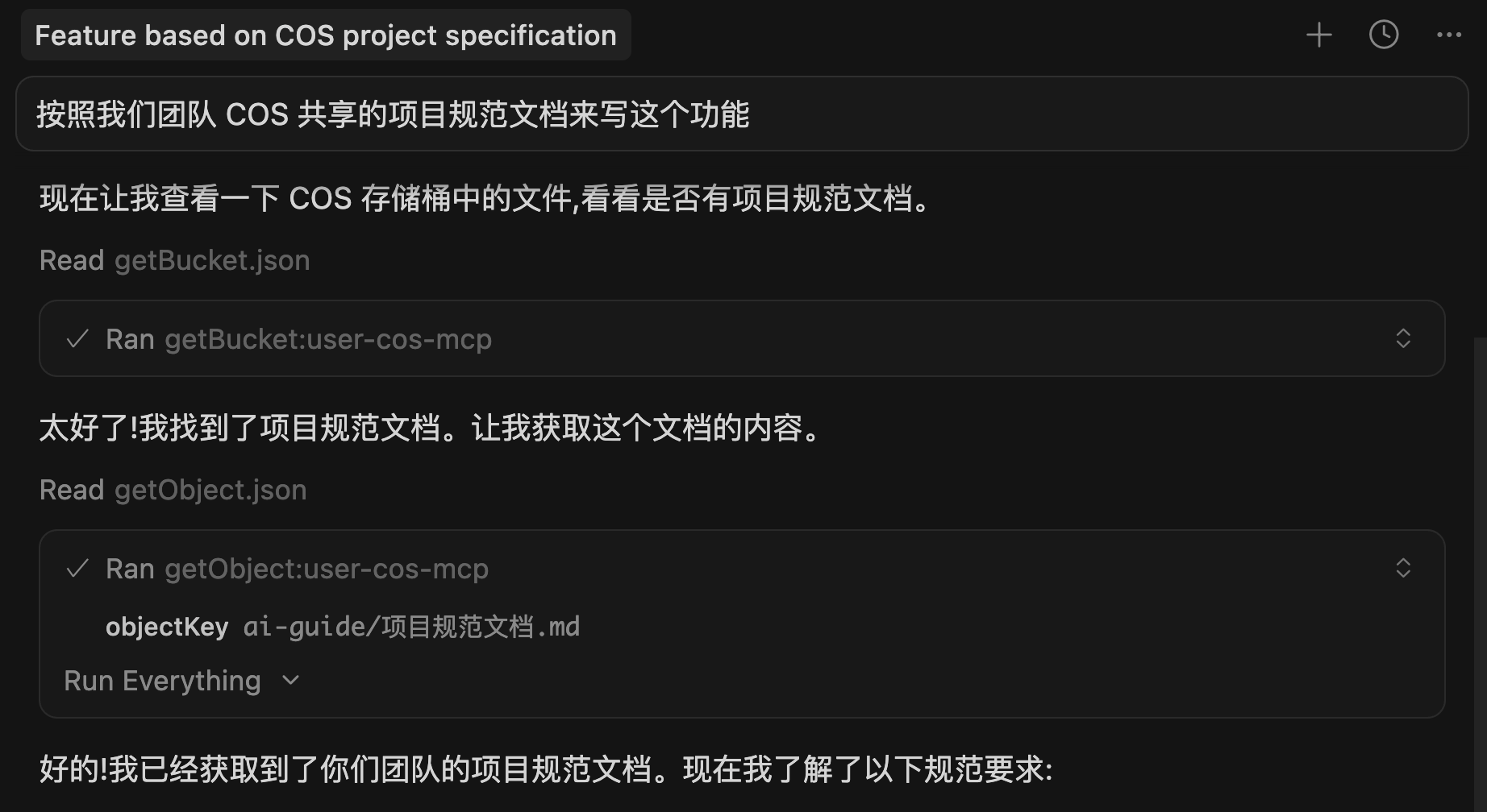 比如我跟 AI 说:“按照我们团队 COS 共享的项目规范文档来写这个功能”,它就能自动从 COS 里读取规范文档,然后按照规范来写代码。