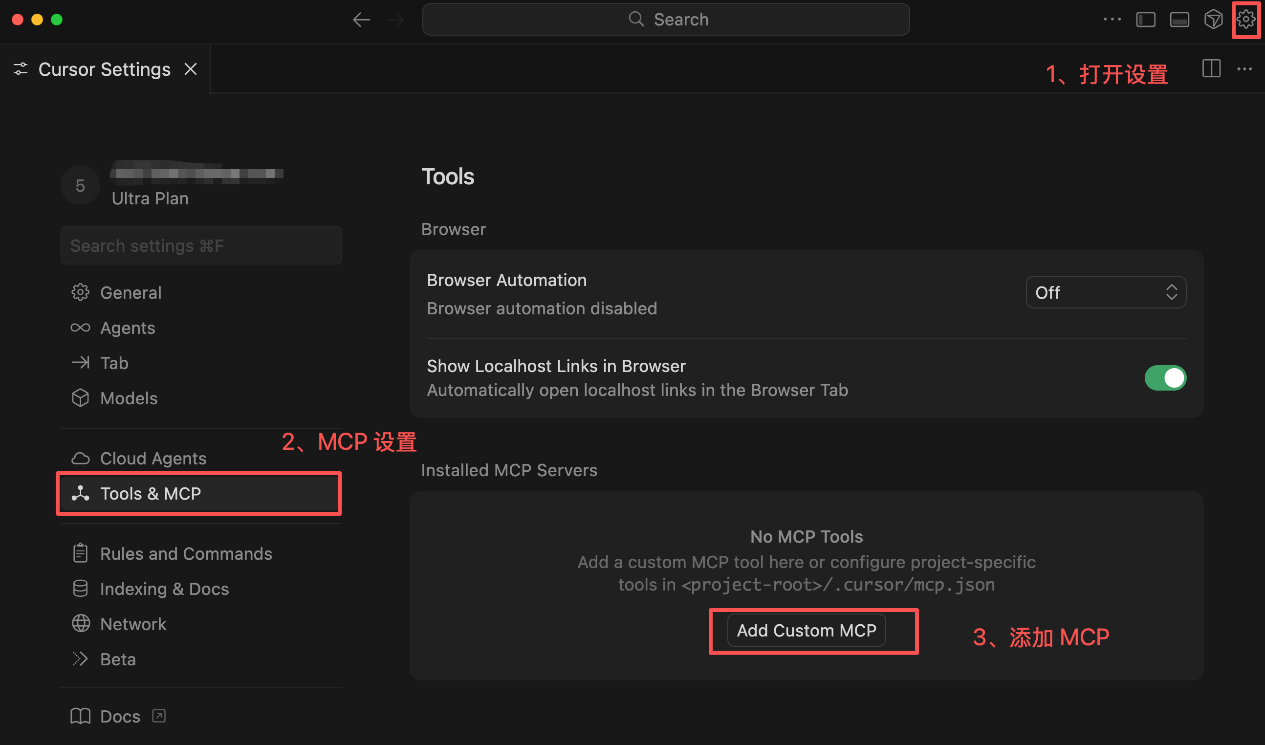 打开 Cursor 设置,找到 Tools & MCP,点击 + New MCP Server。