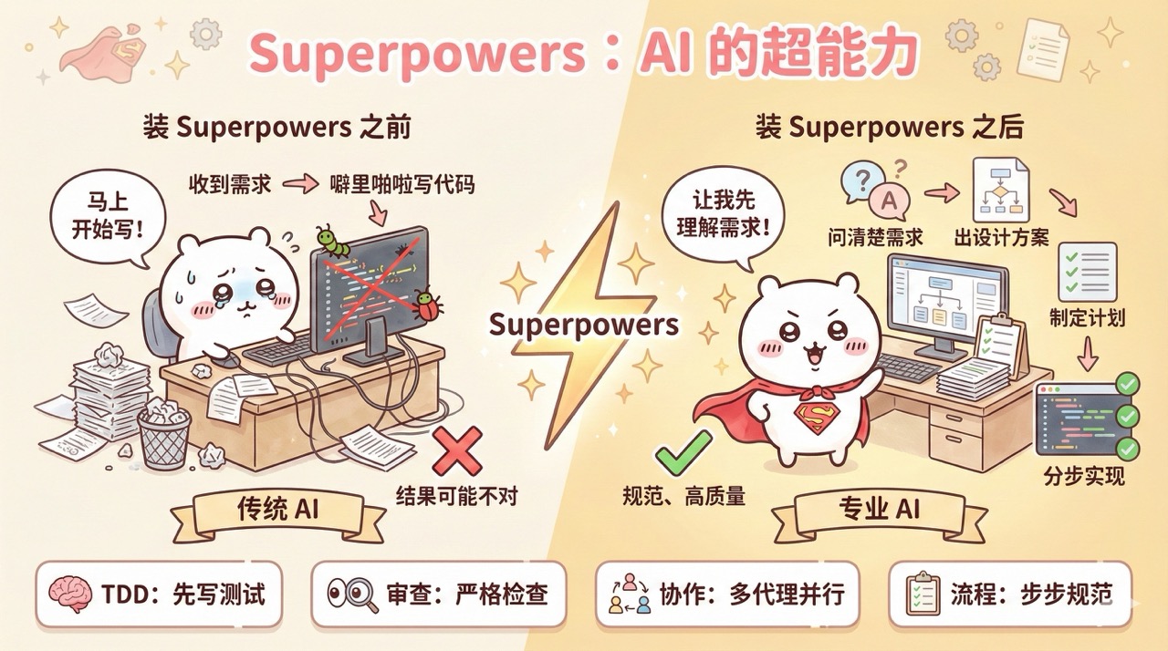 如果你正在开发大型项目,需要团队协作,那么可以试试 Superpowers,前期多花的时间会在后期省回来。但是如果你只是想写个简单的脚本或者快速验证一个想法,用它就有点儿牛刀杀鸡了,真没必要。